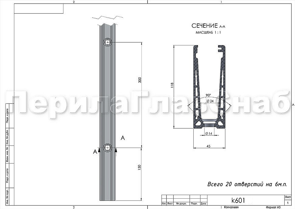 Профиль сверленый: от края 150 мм, следующие отверстия с шагом 300 мм.