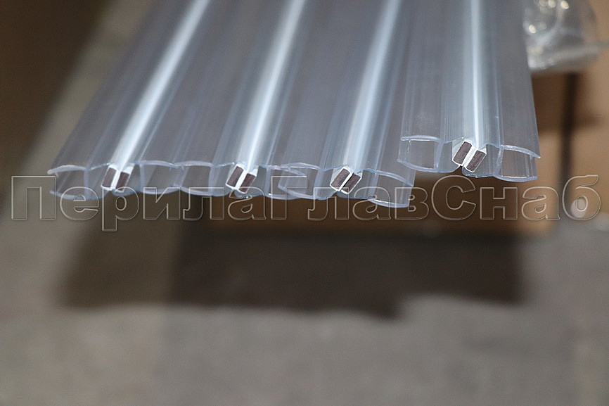 Комплект из двух профилей с магнитом. Монтируется по всему периметру стеклянного листа. Позволяет герметично соединять стеклянные панели между собой благодаря встроенному магниту. Толщина одного типоразмера составляет 1.5 мм, длина – 2200 мм. За счет своих свойств (стойкость к щелочам, минеральным маслам и многим кислотам) прекрасно подходит для крепления стеклянного листа по всему периметру. Применение этого комплекта гарантирует отсутствие течи в вертикальной части конструкции. Уплотнитель из комплекта применим в сочетании со стеклом толщиной до 8 мм и углом в плане до 135.