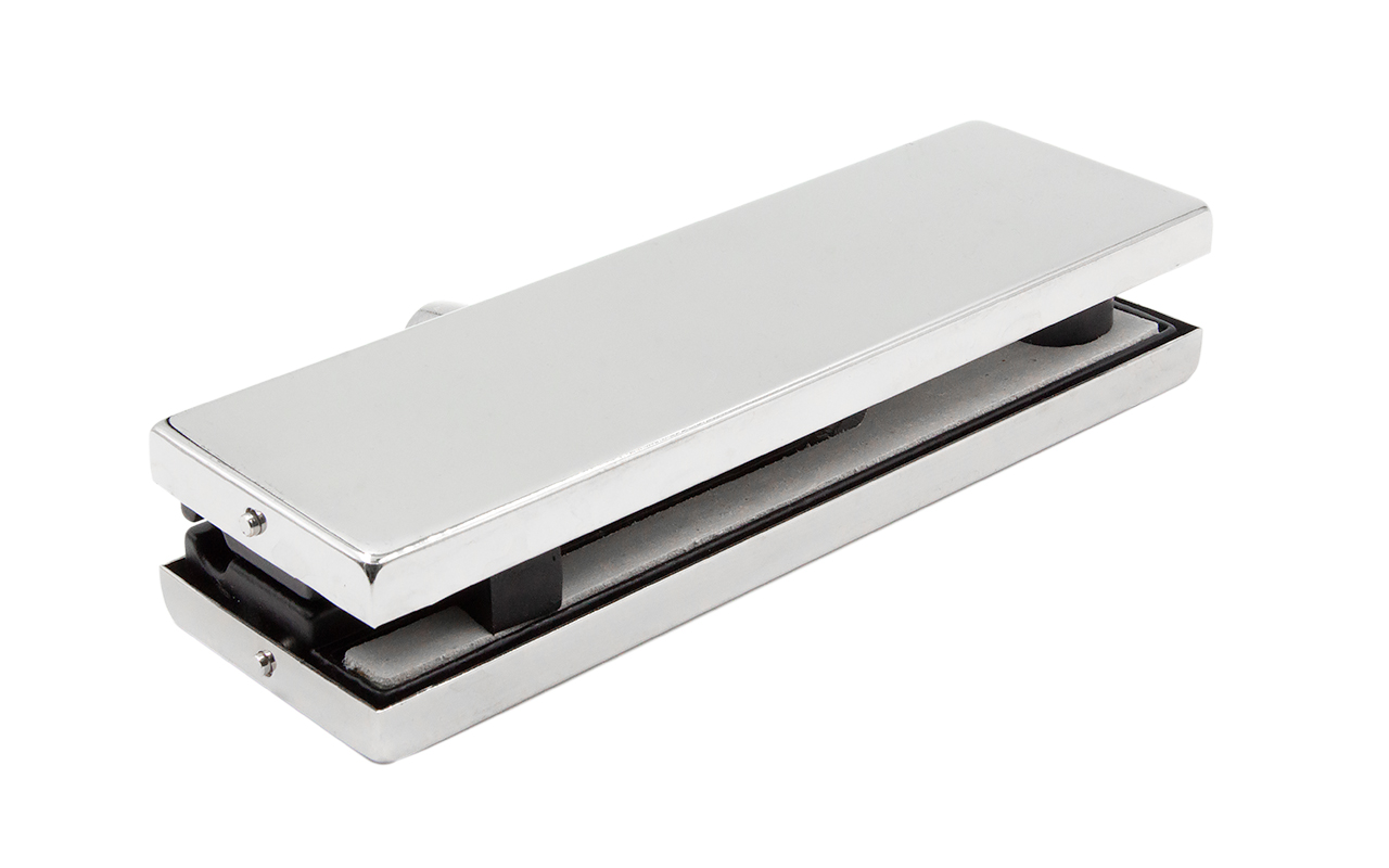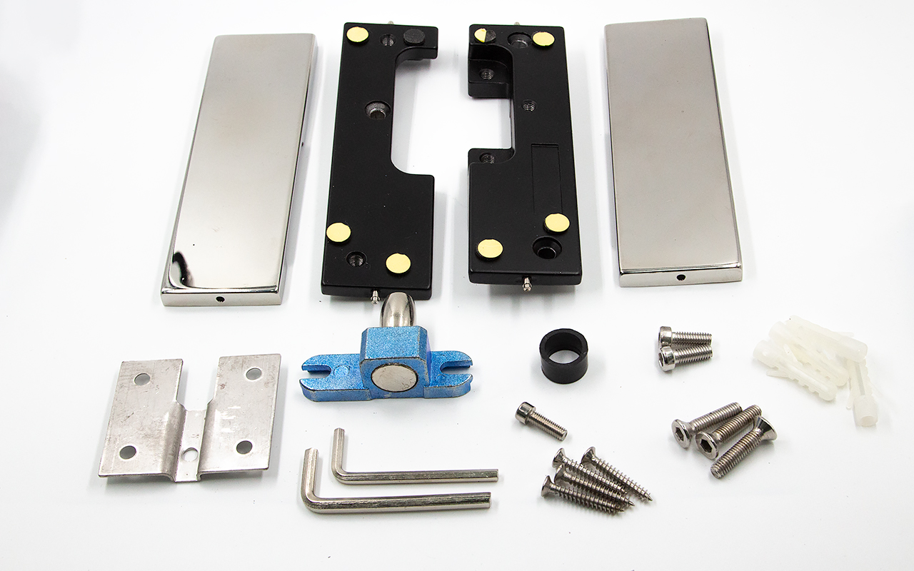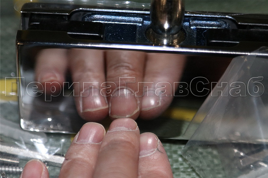 фиксируем к стене дюбель саморезами, далее сбоку нажимаем на крепления крышек и снимаем. Отвинчиваем винты, и фиксируем фитинг в подготовленный вырез в стекле. Далее закручиваем и фиксируем обратно крышки.