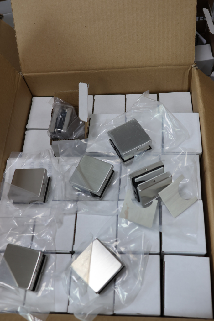 Коннектор разбирается на две половинки, Г-образной стороной крепится к стене на саморезы. Затем к нему прикладывается стекло со специальными полукруглыми вырезами, а далее второй половинкой стекло зажимается.