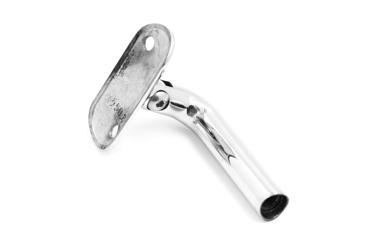 Это предельно экономичная и от того чрезвычайно выгодная модель выносного держателя бокового крепления поручня на круглую стойку. Легко монтируется как на традиционных ограждениях из нержавейки, так и на сборных ограждениях пандусов для инвалидных колясок. Допускается монтаж к стойке насквозь, через шпильку М8. При этом ложемент поручня регулируемый по углу наклона, что здорово облегчает жизнб монтажникам на работе с наклонными маршами. Эта тема становится особенно актуальной, когда монтируются огарждения для инвалидов на узких пандусах. Ведь в этом случае стойки можно поставить на пластины бокового крепления k056, не наклоняя стойки перпендикулярно линии марша, а устанавливая их вертикально.