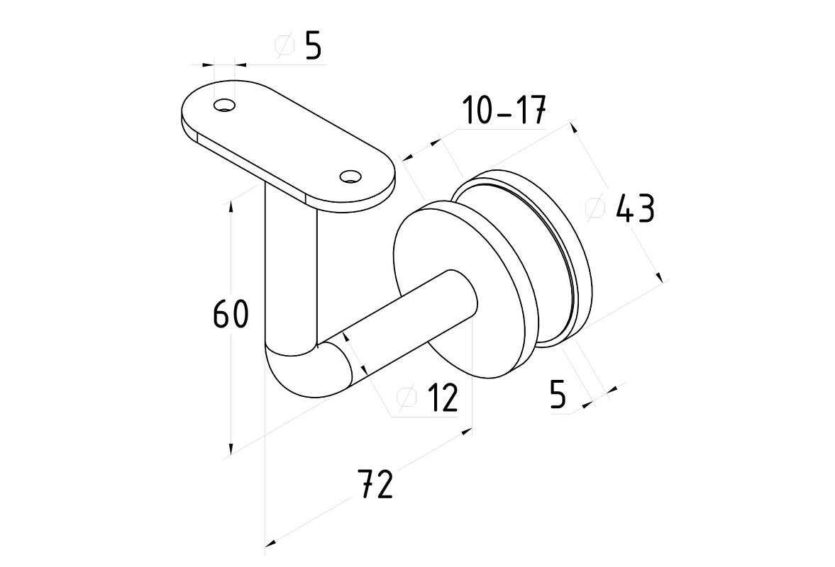 Держатель поручня на стекло 10-17 мм, с ложементом на плоскость, вынос 60х70 мм, Ø43х5 мм, нержавеющая сталь AISI 304, полированная