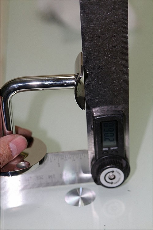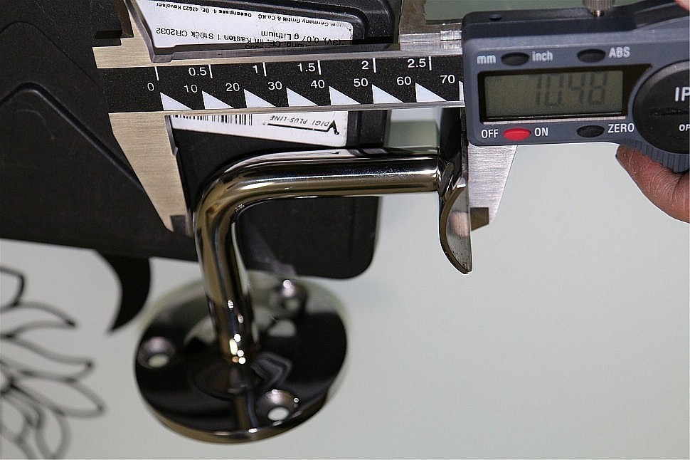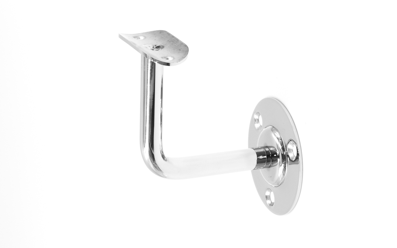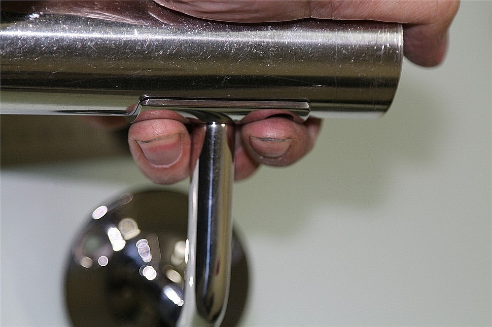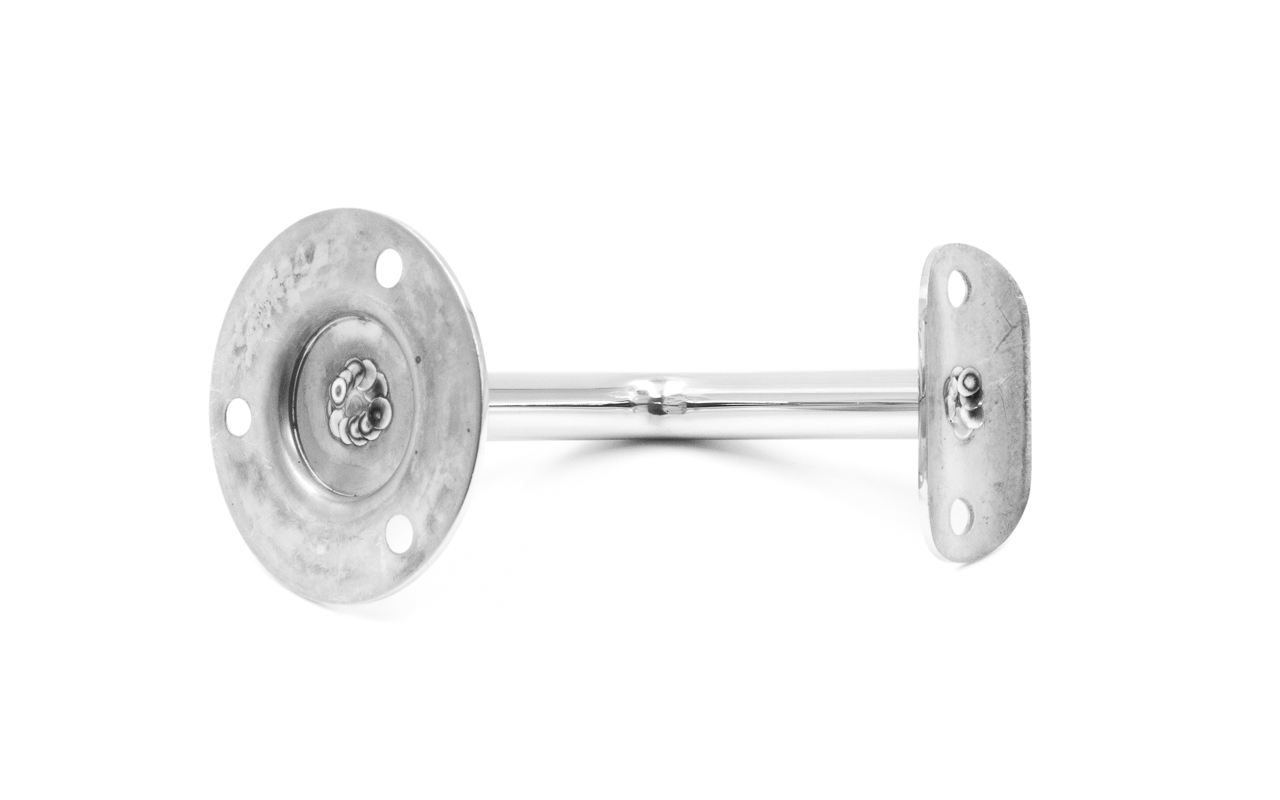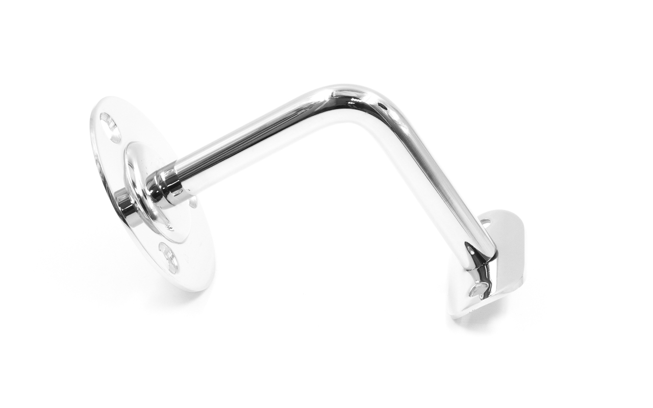 К стене стальной держатель крепится фланцем на три самореза Ø3 мм. Ложемент у данной модели не регулируемый и идет с двумя отверстиями для крепления поручня на саморезы.