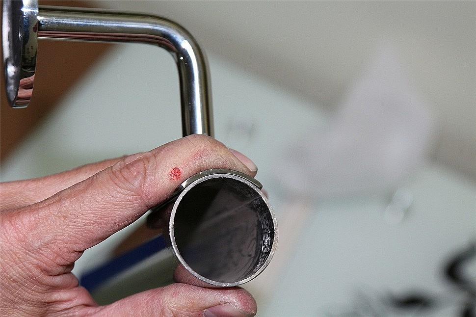 Пристенок с ложементом под трубу диаметром 38.1 мм, отверстия в фланце для самореза с потайной головкой. Деталь полированная, сварная. Марка стали - AISI 304.