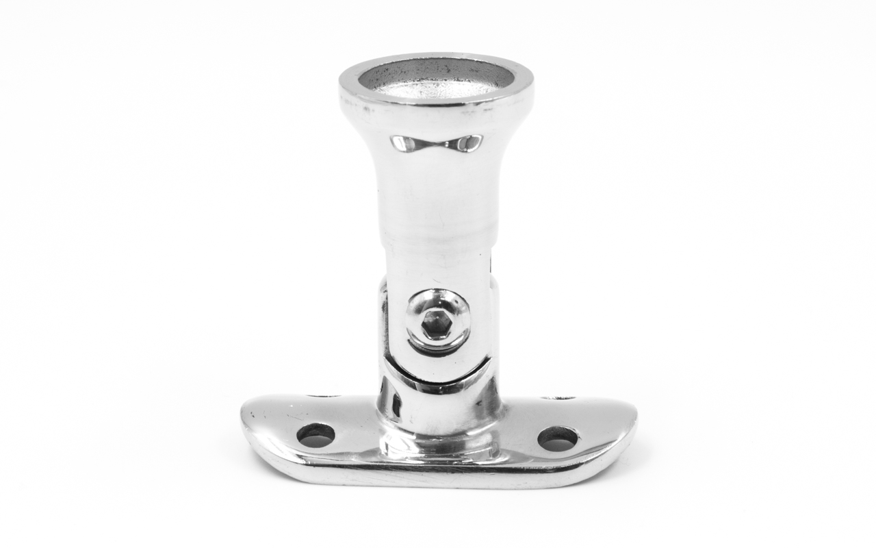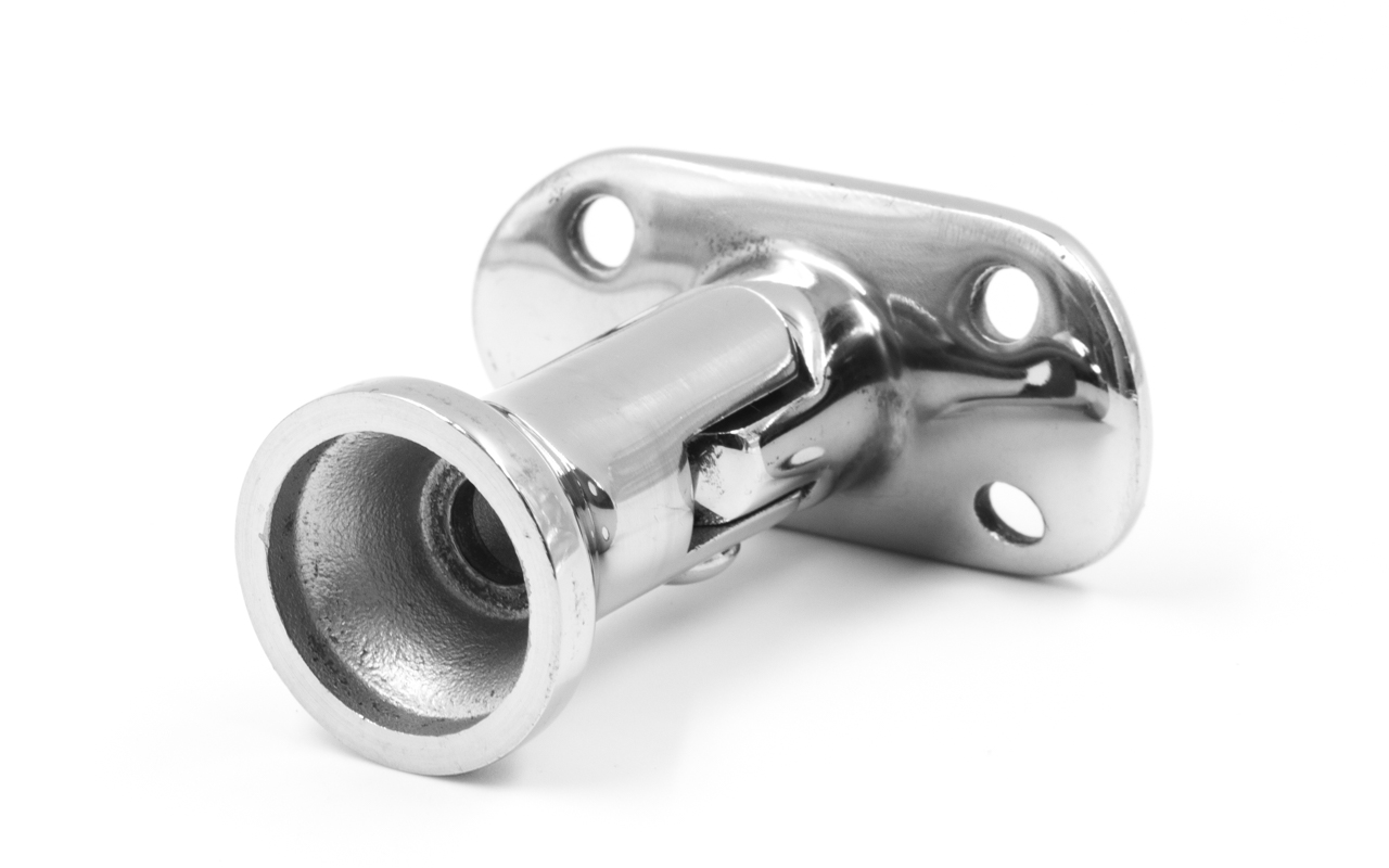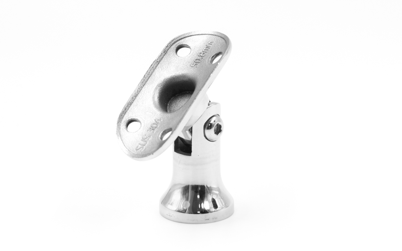 Наконечник стойки "колокольчик" на плоскость, с регулируемым ложементом с отверстиями под поручень диаметром Ø50.8 мм. Деталь литая, полированная, нержавеющая. Марка стали - AISI 304