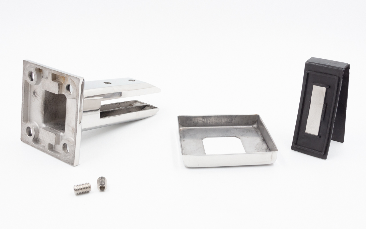 Стеклодержатель штампованный  под стекло 8 мм (4+4 мм), квадратный, под стойку Ø38.1 мм (40х24х48), полированный (AISI 304) k351 купить в Нижнем Новгороде