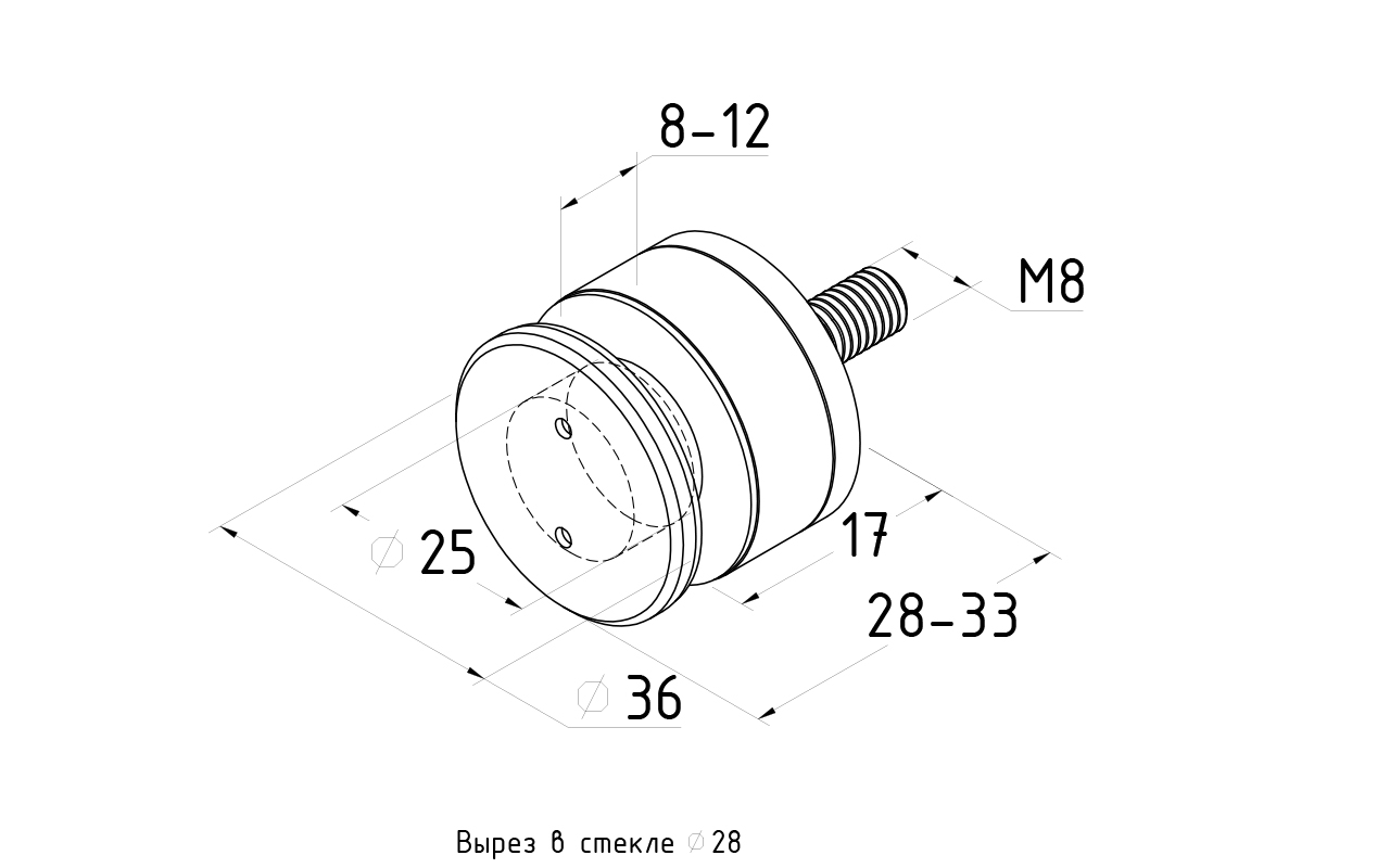 Ø36x28х40 мм отверстие в стекле 26-28 мм винт М8 х 65, шаг резьбы 1.12 (DIN 6912)
