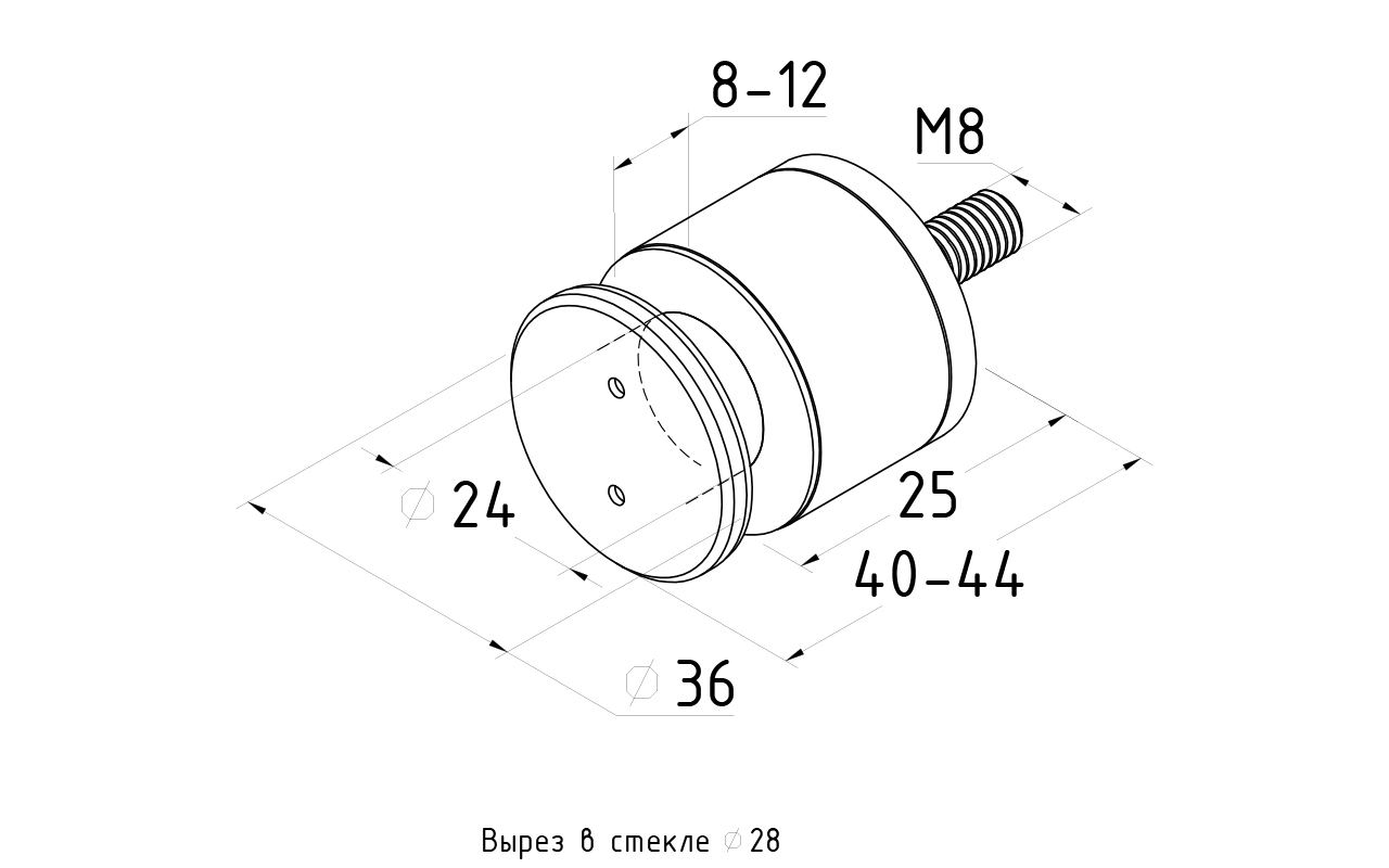 Корпус стеклодержателя приваривают или прикрепляют на саморез, либо штатный винт к стене. А в стекле делают отверстие Ø28 мм под шток стеклодержателя. Толщина стекла варьируется в диапазоне от 8 до 12 мм.