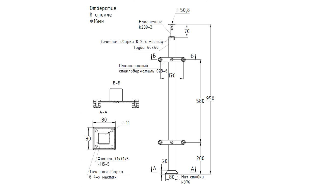 Стойка квадратная 40х40: 4 литых стеклодержателя, шлифованная, высота 950 мм AISI 304 k746-7 купить в Нижнем Новгороде