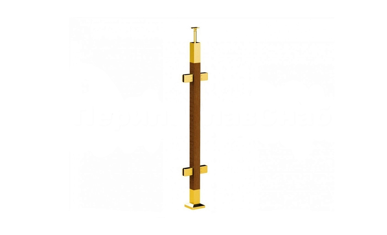 Готовая стойка 40х40х950 мм, деревянная, со вставками из нержавеющей стали 2х100 мм, с 4 зажимными стеклодержателями, под золото