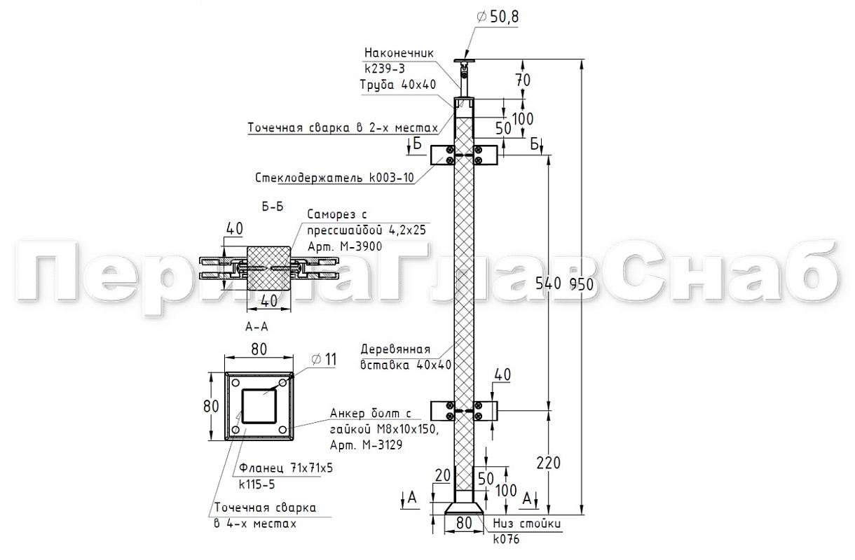 Стойка квадратная 40х40: 4 литых стеклодержателя, шлифованная, высота 950 мм AISI 304 k746-7 купить в Нижнем Новгороде