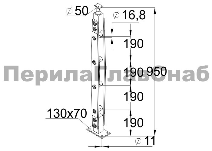 Стойка квадратная 40х40: 4 литых стеклодержателя, полированная, высота 950 мм (AISI 304) k746 купить в Нижнем Новгороде