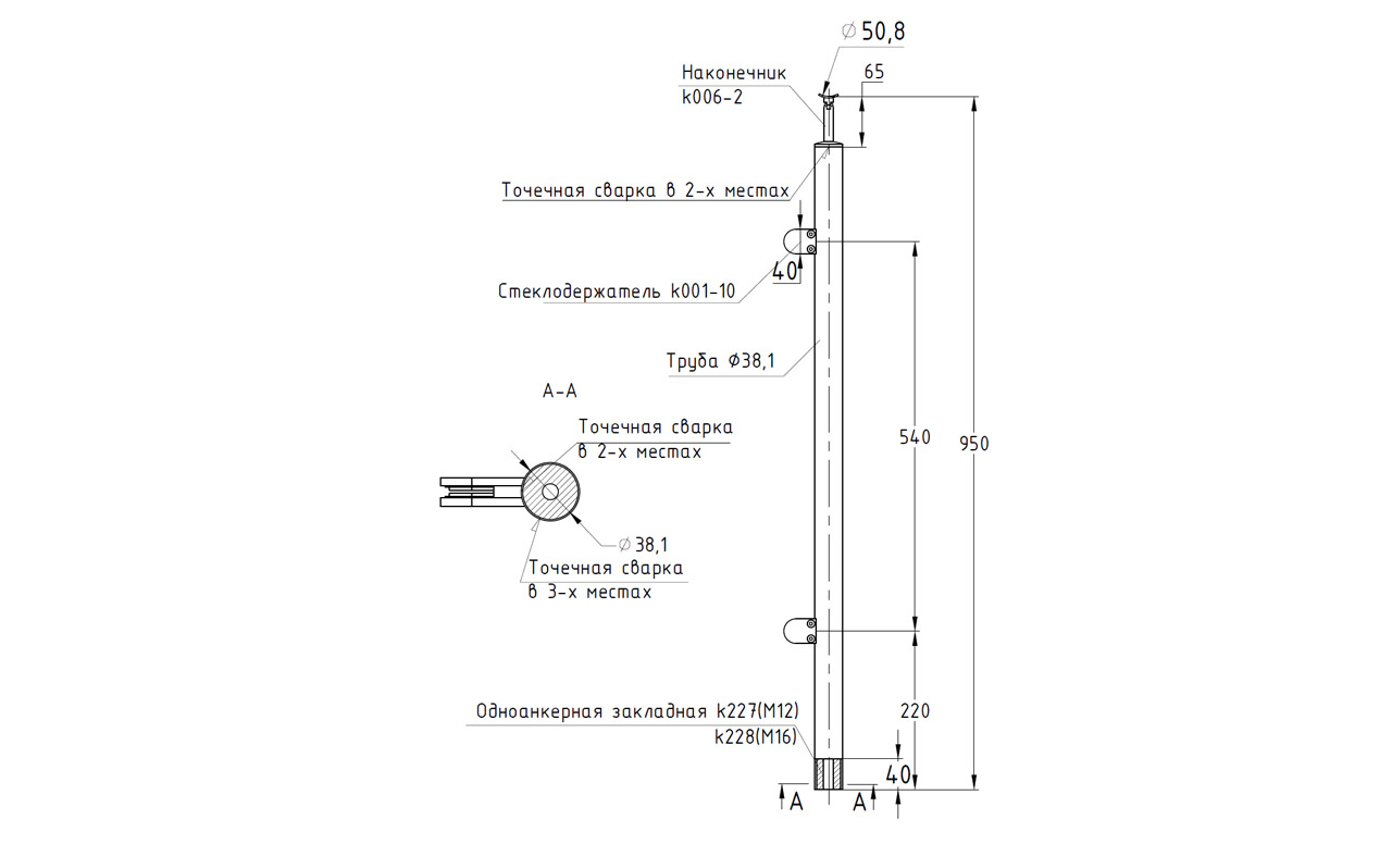 Готовая стойка Ø38,1 мм, с одноанкерным крепежом М12, высота 900 мм, полированная (AISI 304) k735 купить в Нижнем Новгороде