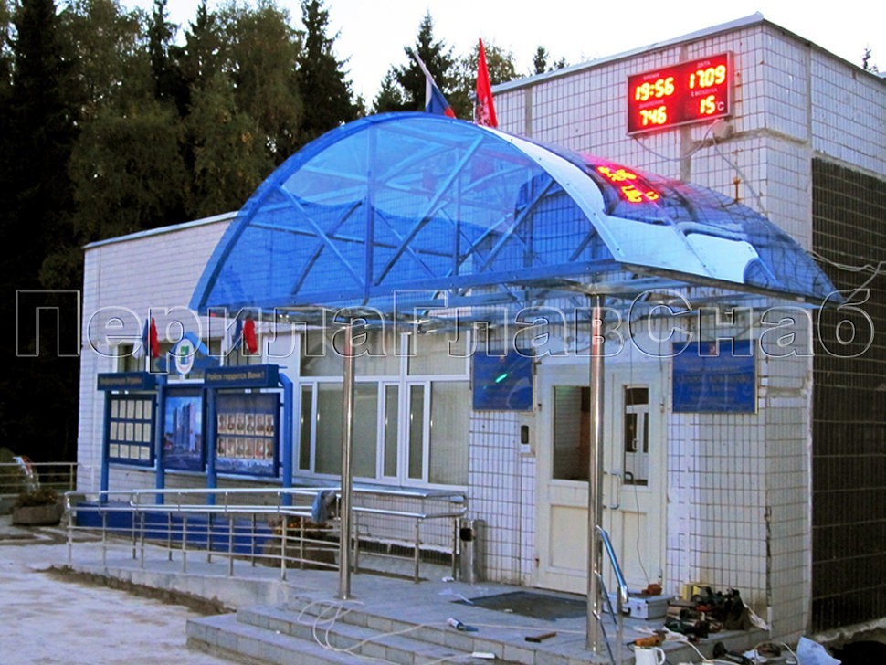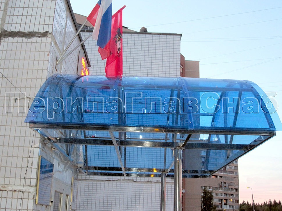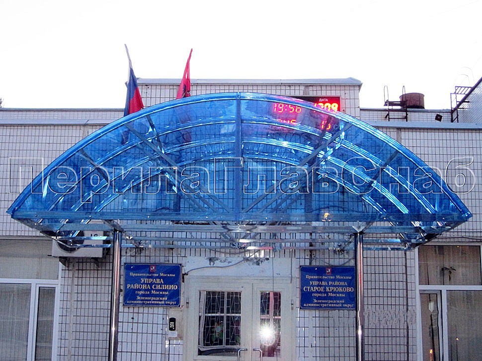 На фасаде здания Управы г. Зеленограда были установлены металлоконструкции из козырьков с покрытием цветным поликарбонатом и каркасом из нержавеющей стали.
