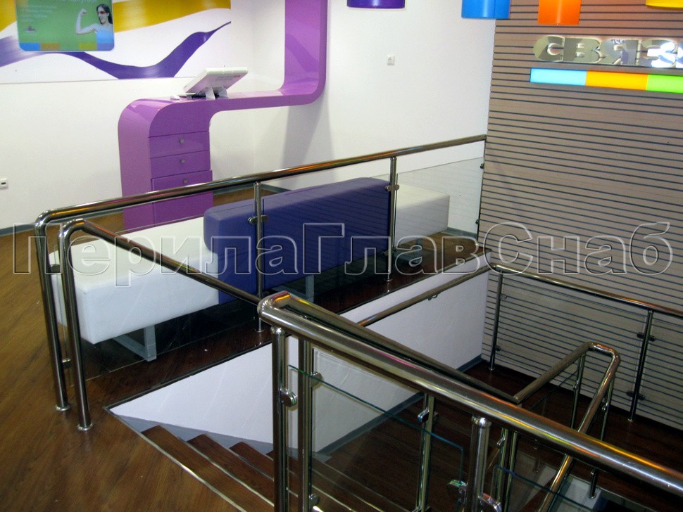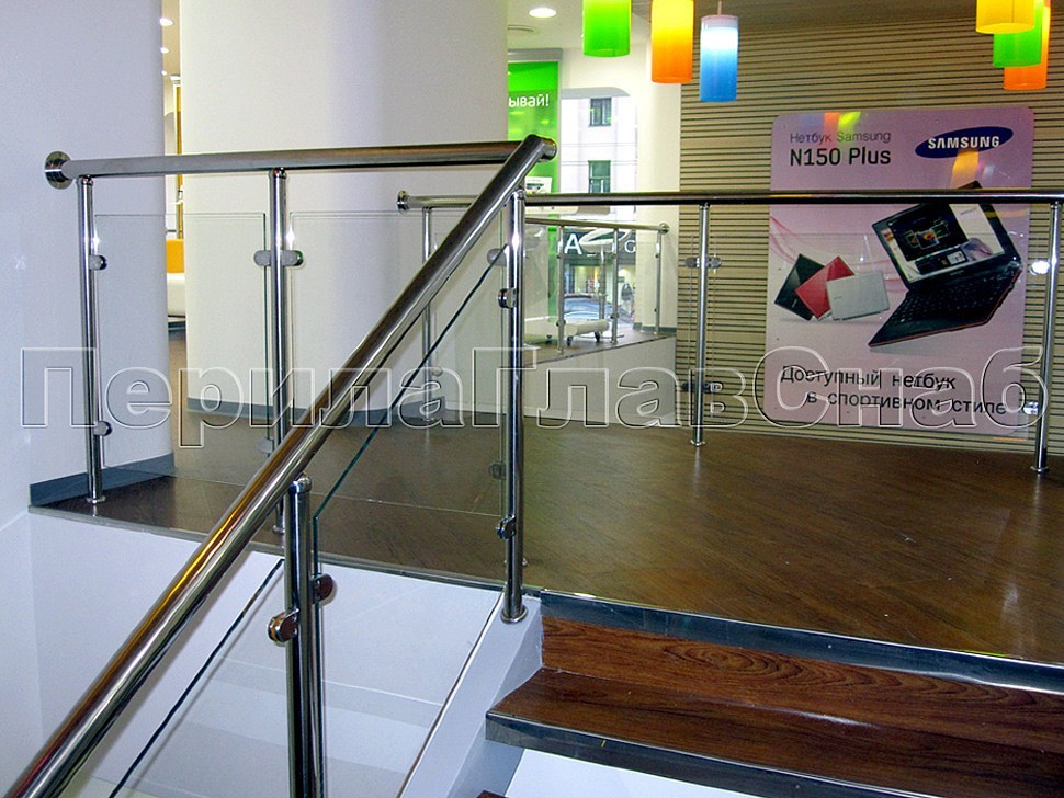 В качестве характерной особенности данного проекта следует отметить закаленное прозрачное стекло на зажимных стеклодержателях, установленное под наклоном в торец тонкого поребрика марша, а также облицовку ступеней лестницы деревом. При этом заказчик выразил желание облицевать торцы ступеней угловыми полосками нержавеющей стали для увеличения срока службы деревянной обшивки.