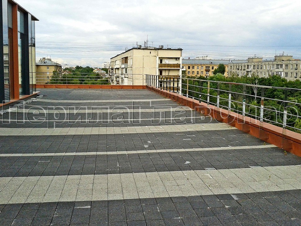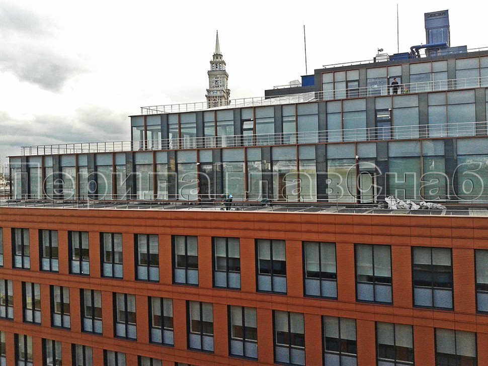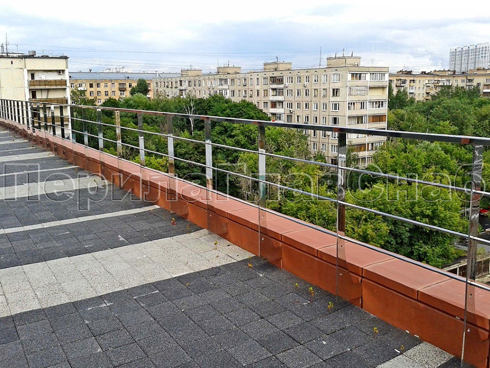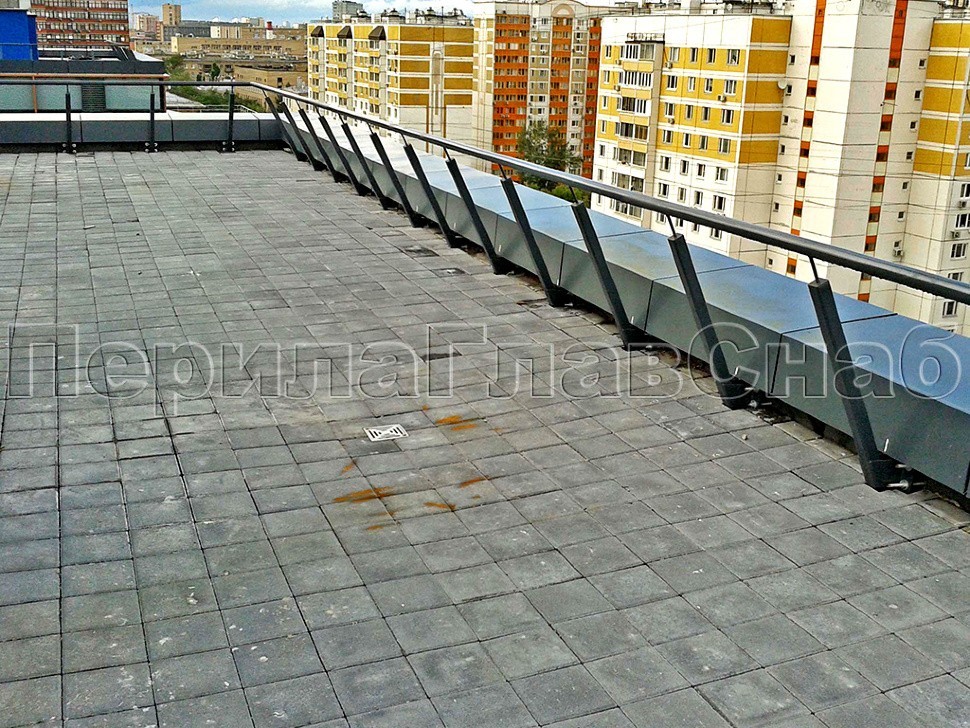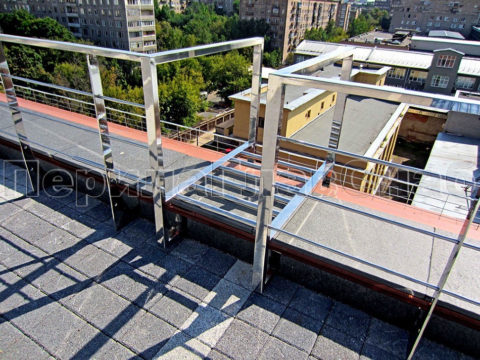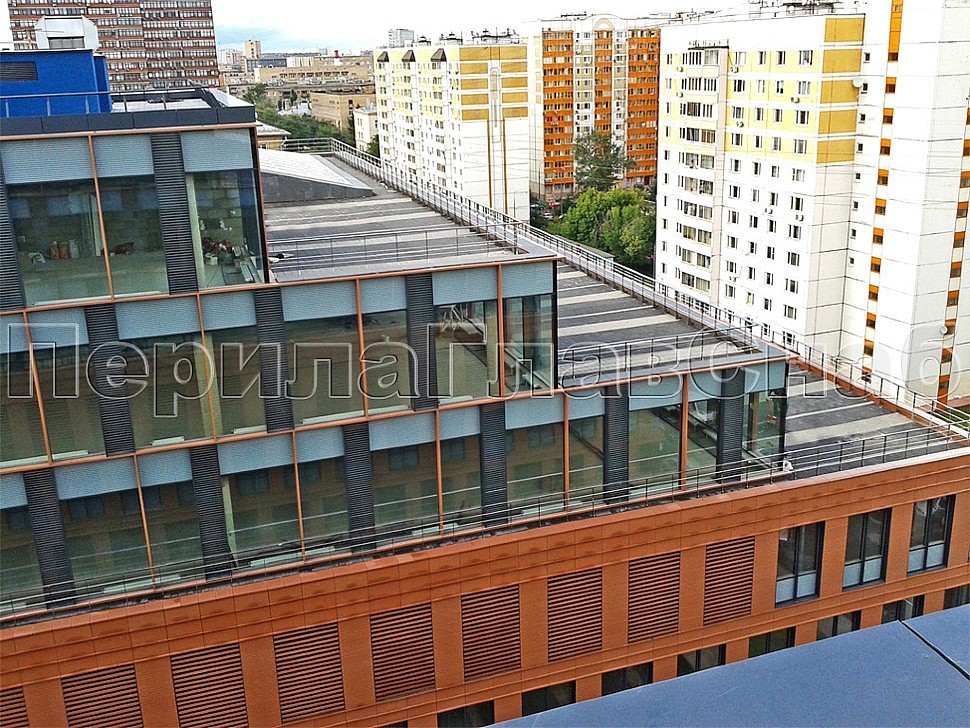 Ограждения парапетов монтировались на нескольких уровнях бизнес-центра. Там, где крыша приспособлена для нахождения сотрудников офисов, установлена полированная конструкция. Стойки смонтированы боковым креплением и соединены между собой тремя ригелями. А в качестве поручней использована профильная труба из нержавеющей стали.