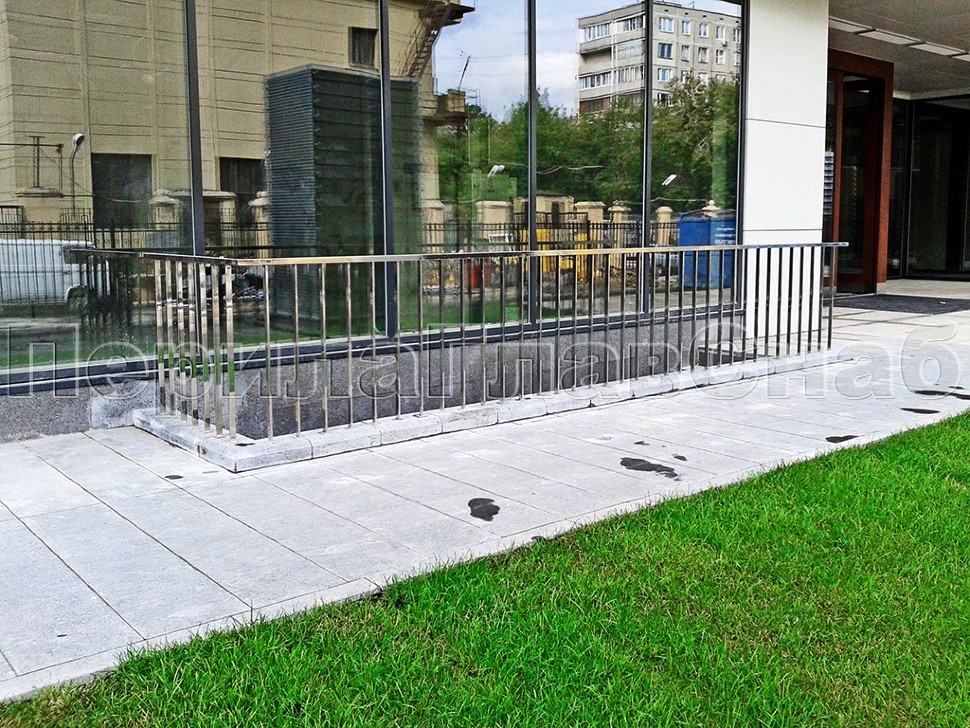 Значительной долей работы на данном объекте была установка лестничных ограждений внутри здания. Для этого объекта были смонтированы стойки и перила круглой формы из нержавеющей полированной стали. Боковое крепление стоек было продиктовано ограниченным пространством на лестничном марше. Ригели и поручни между собой не завязаны и снабжены двумя перемычками. При этом полностью соблюдены нормы пожарной безопасности и расстояние между маршами не менее 100 мм, предусмотренное для протягивания пожарного шланга.