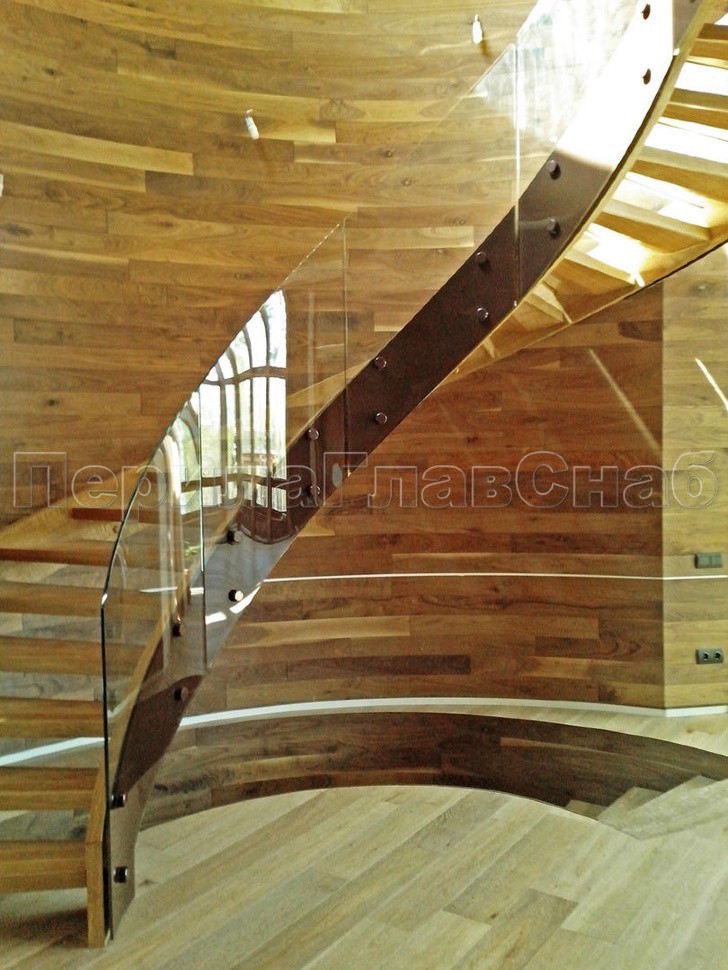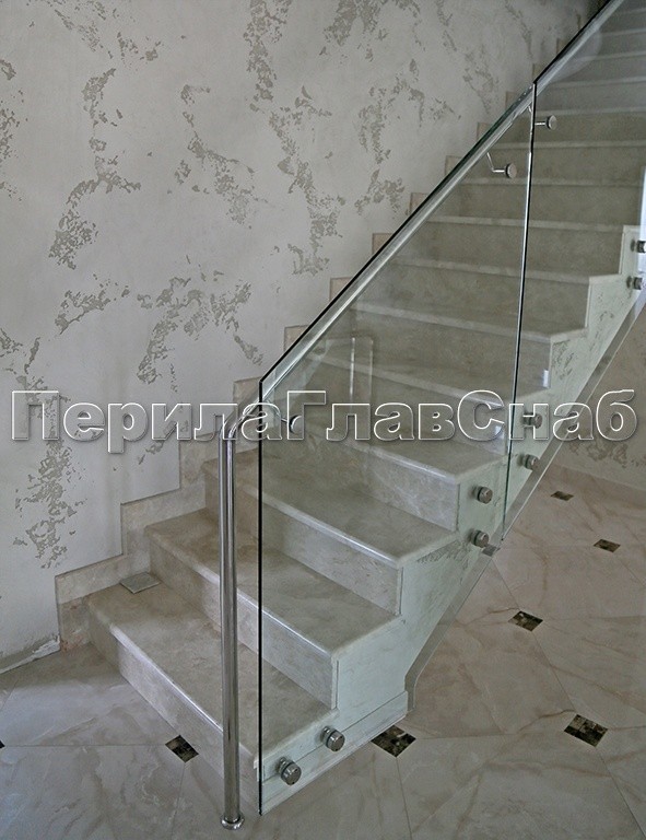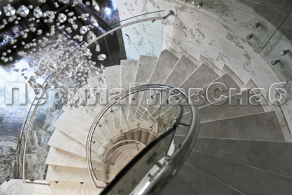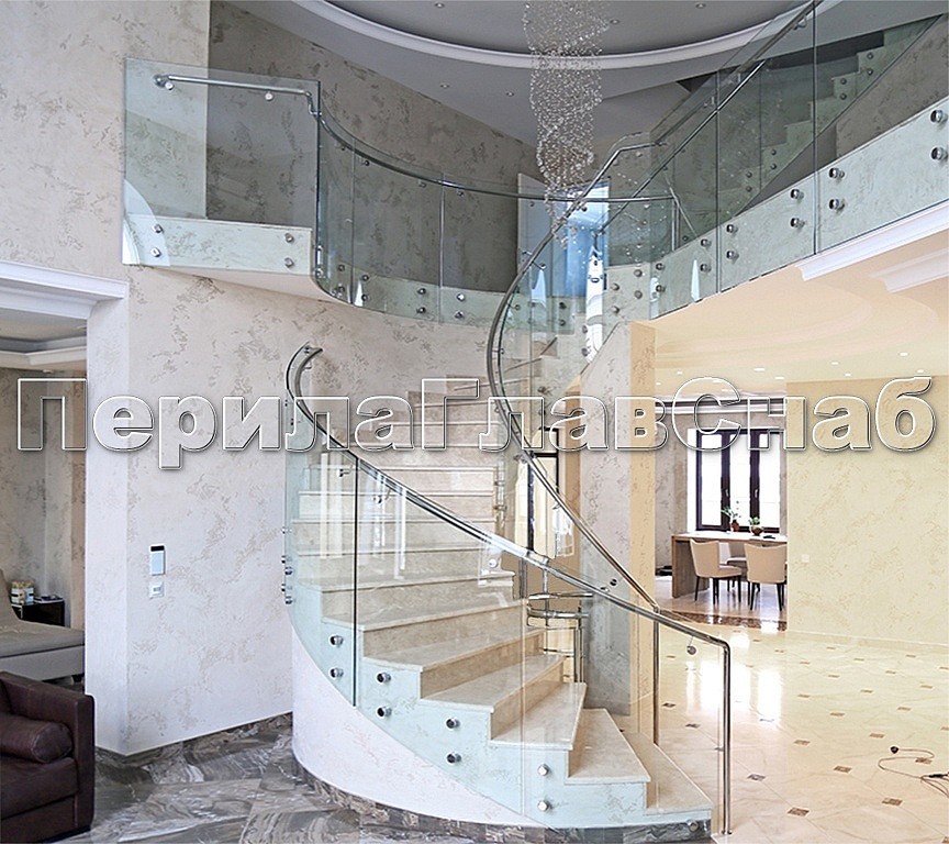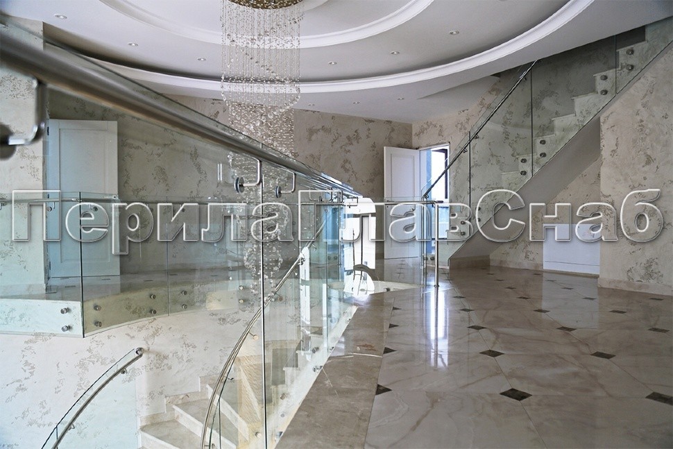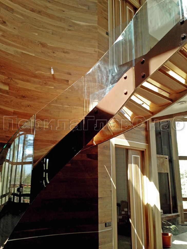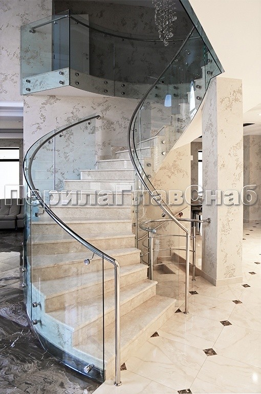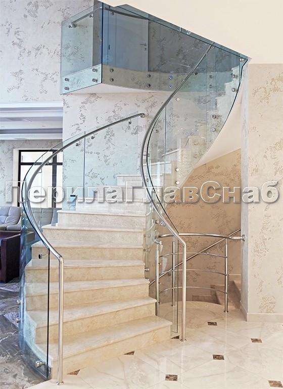 Ограждение забежной лестницы с моллированным стеклом. Нержавеющий полированный поручень повторяет контур стекла.