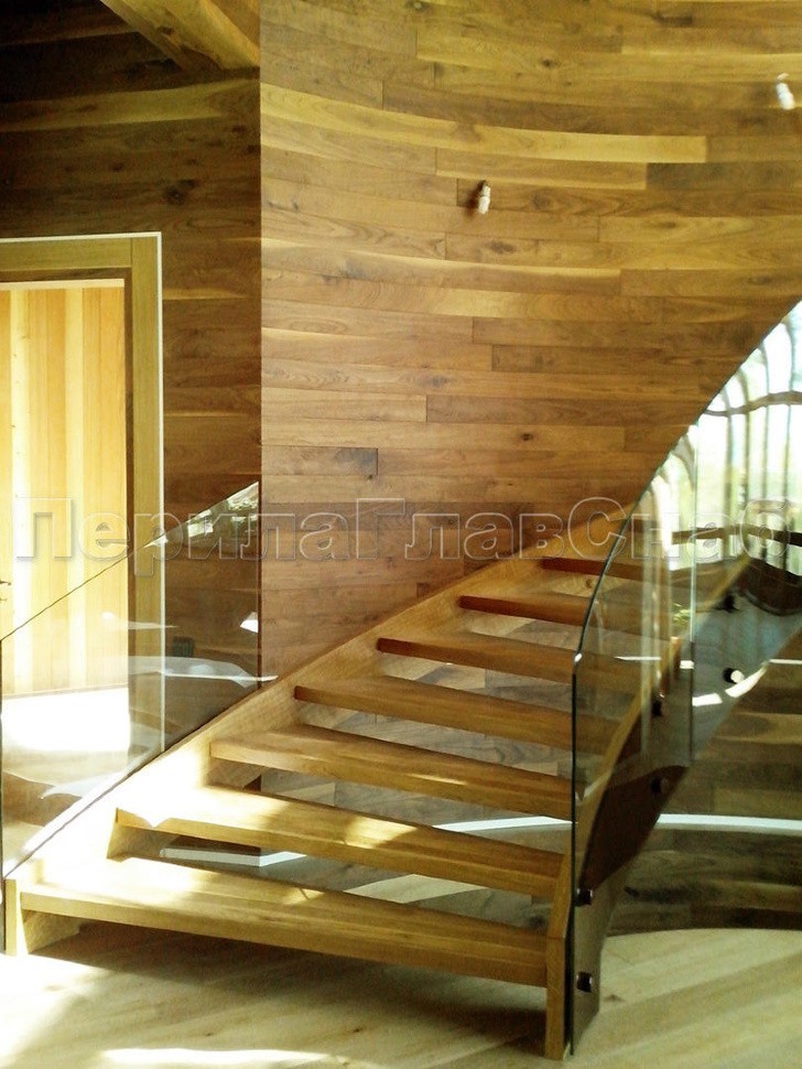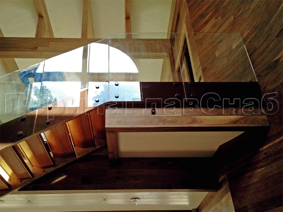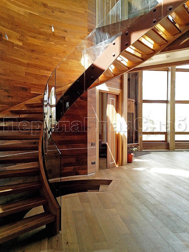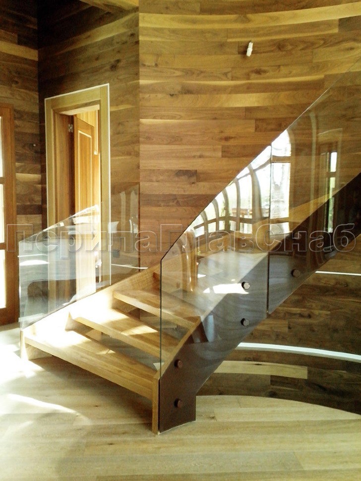 Ограждение забежной лестницы в частном доме выполнено на несущем стекле, поручень на выносных держателях завязан в пол.