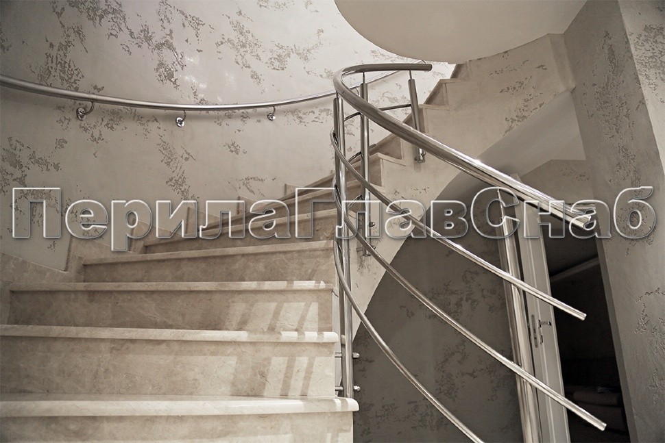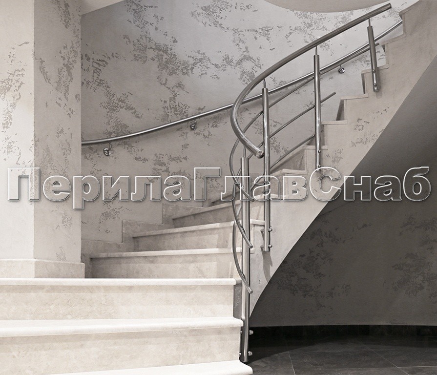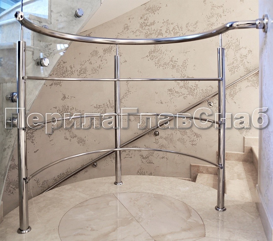 Ограждение без ригеледержателей прокатанное по радиусу. Ригели оканчиваются сразу после стойки без вылета, круглый поручень д. 38мм оканчивается во фланец k026 с закрытым крепежом.