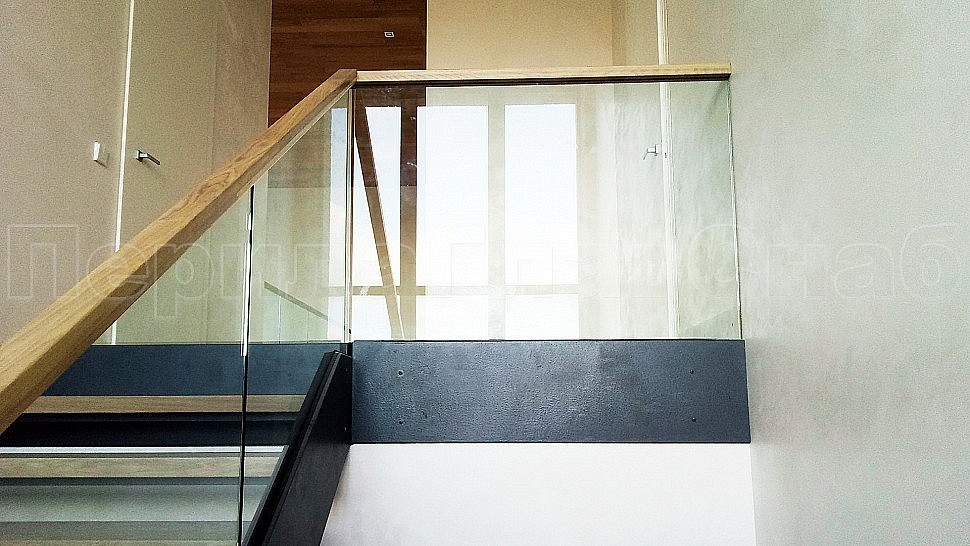 Крайне удачным является решение установить именно стеклянные ограждения на данном объекте: как стекло, так и стальной поручень отлично гармонируют на фоне кирпичной стены шоколадного и соломенного цветов