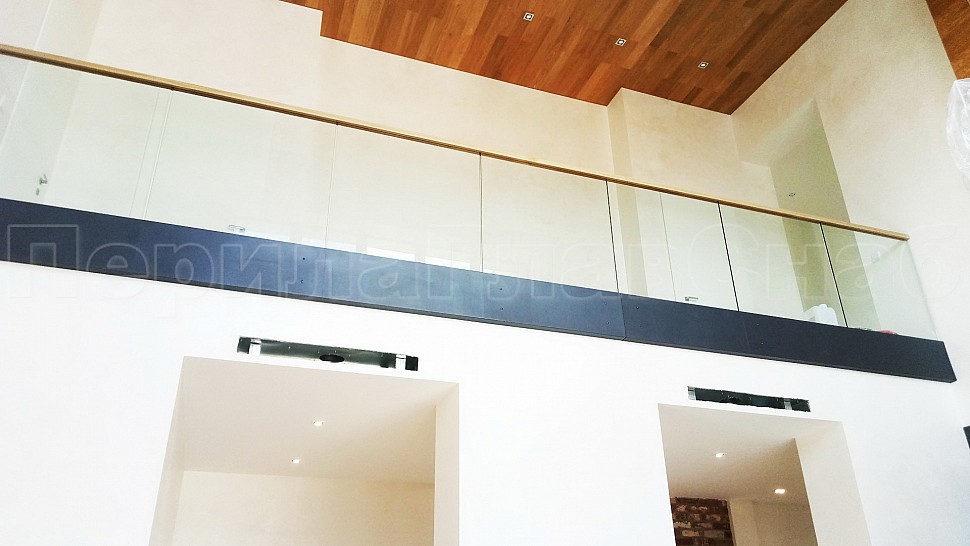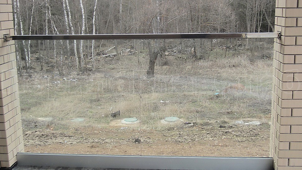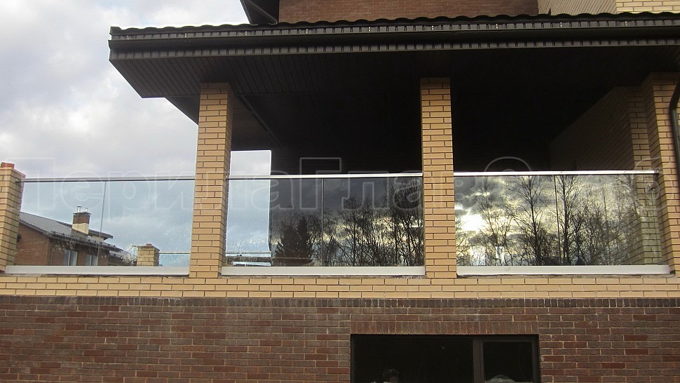 Установили цельностеклянное ограждение на балкон. Стекло установлено в алюминиевый профиль с пазом. Сверху на стекло закреплен поручень из нержавеющей стали. По краям конструкция крепится на фланцы к колоннам и стенам.