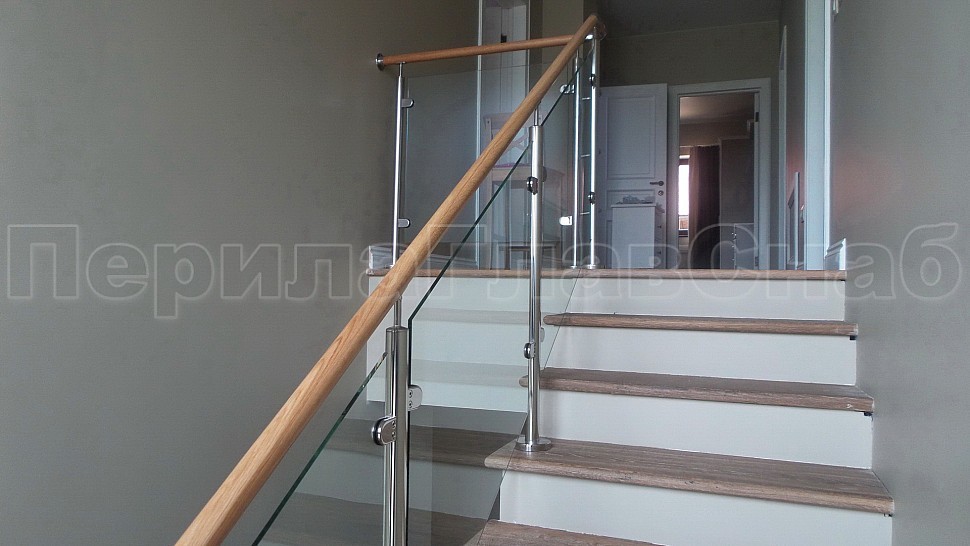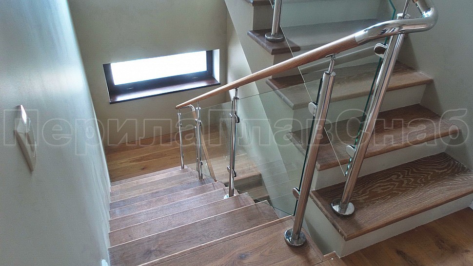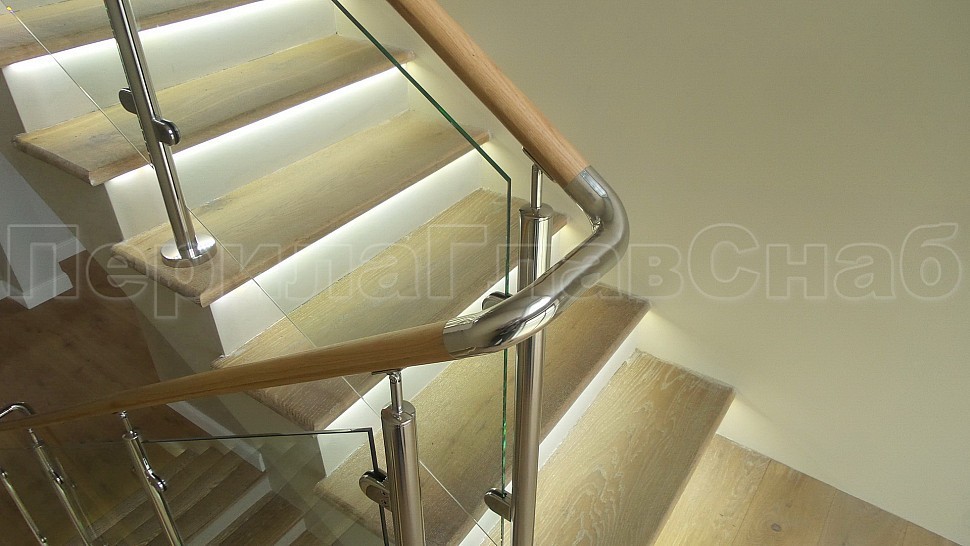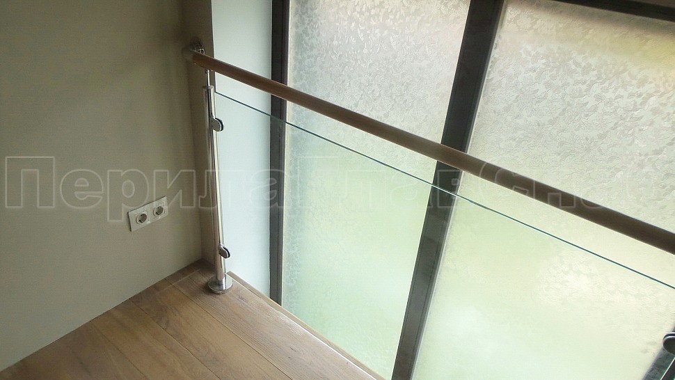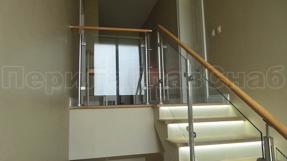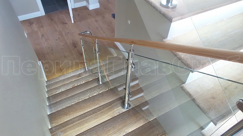 Цельностеклянное ограждение для лестницы на мини стойках с деревянным поручнем в частном доме