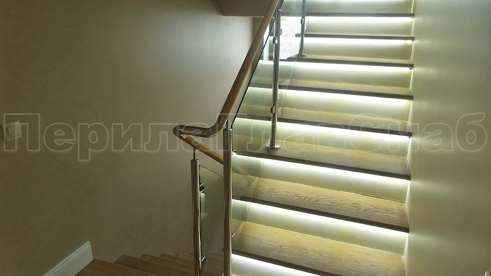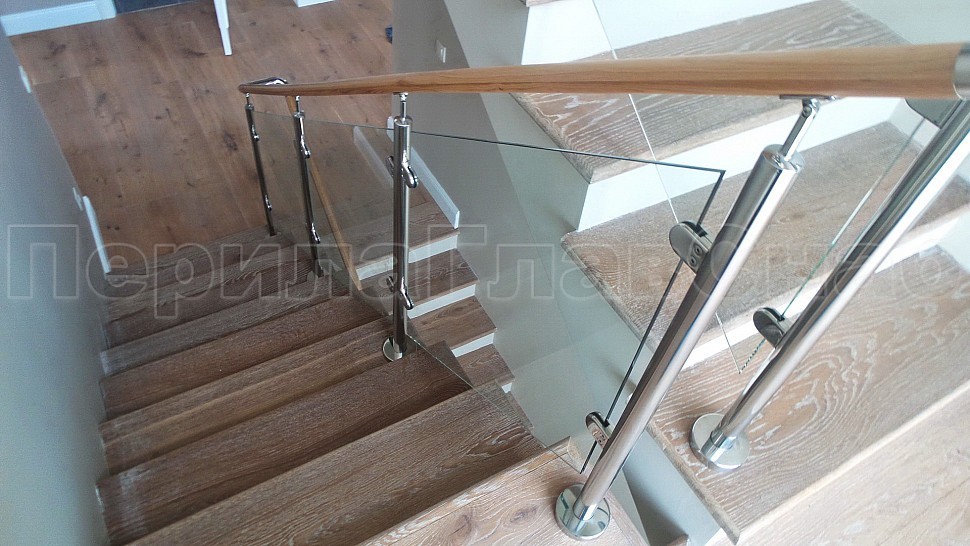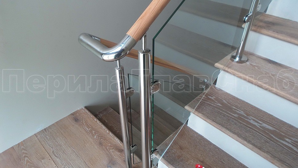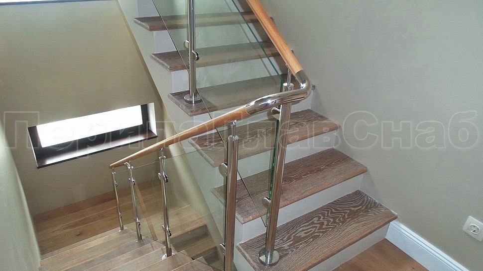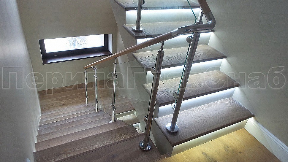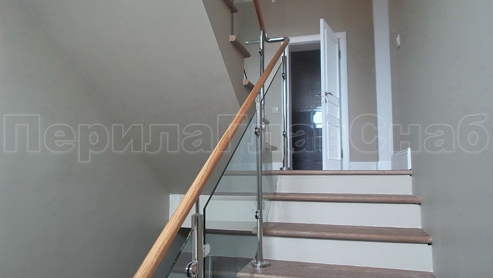 Цельностеклянное ограждение для лестницы на мини стойках с деревянным поручнем в частном доме