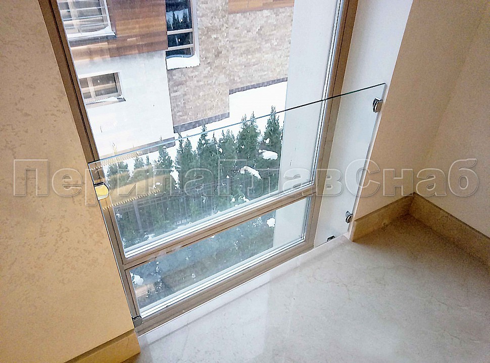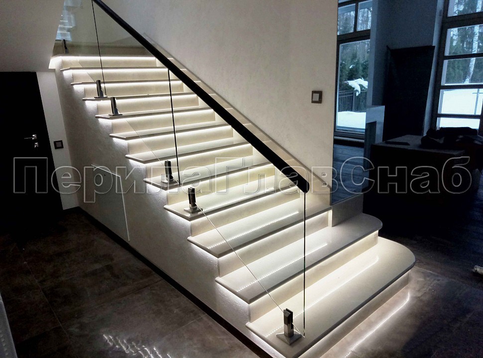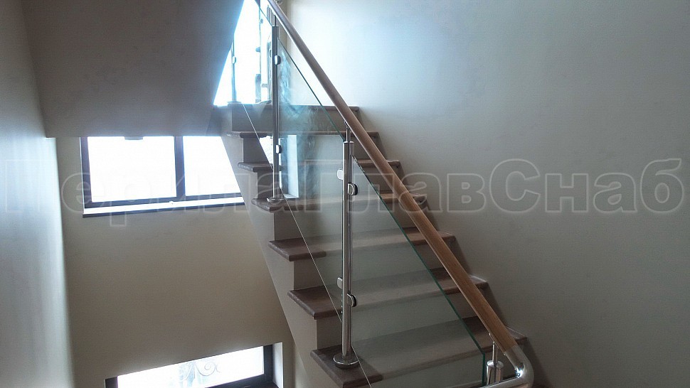 Цельностеклянное ограждение на мини стойках с деревянным поручнем в частном доме. Сочетание классики мраморных ступеней и абсолютно современного ограждения из стекла. Стеклянные ограждения с деревянным поручнем изящно смотрятся в интерьере, подчеркивая его индивидуальность.