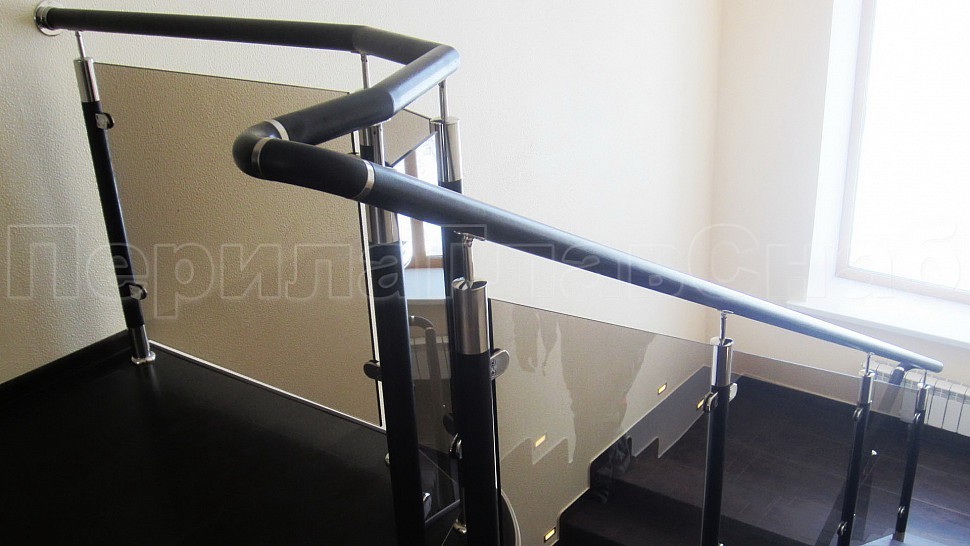 В загородный дом, было установлено лестничное ограждения высотой 950 мм с бронзовым каленым стеклом толщеной 8 мм, с деревянным поручнем диаметром 50 мм, стойки диаметром 50 мм из полированной нержавеющей стали с деревянными вставками устанавливаются через две ступени на третью. Верх стойки штырь, низ стойки декоративная крышка. Окончание поручня заглушка. Поручень завязан, свариваемые швы шлифуются и полируются до блеска. Наши лестницы и ограждения всегда найдут место в вашем доме. Впишутся в любой интерьер. Московская область, Солнечногорский район, д.Якиманское