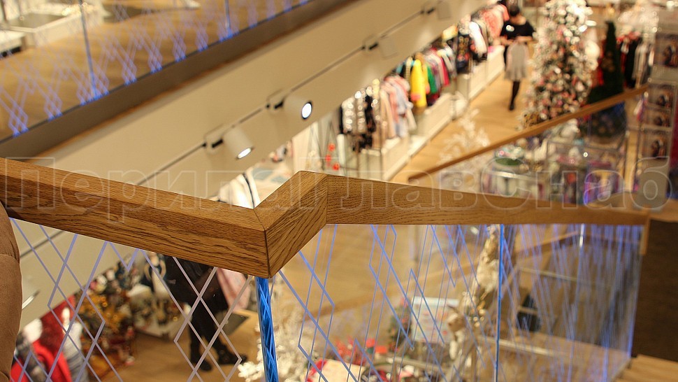 Поручень дубовый клееный по длине и толщине прямоугольный с пазом под стекло габаритами 60х40 мм с лаковым матовым покрытием в один слой. Поручень завязан на поворотах. На стекле с внешней стороны рисунок ромбов нанесенных методом пескоструйной обработки с покрытием защитным лаком. Ширина линий рисунка 5 мм.