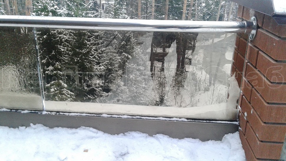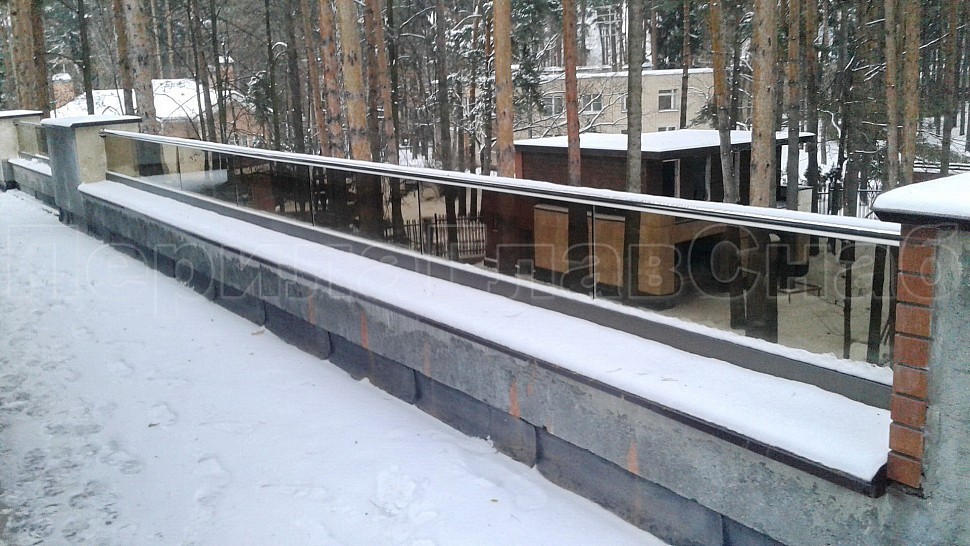 Было произведено ограждение кровли и полированной нержавеющей стали марки AISI304, высотой 600мм от уровня парапета, с установкой на парапет через проставки с каленым стеклом триплекс. Устанавливается в алюминиевый профиль цветом шоколадная бронза, сам профиль крепится в парапет на анкера. Сверху на стекло крепится поручень с пазом диаметром 42мм из нержавеющей стали марки AISI 304, поручень уходит в стену через фланец. Крепление между собой нержавеющих элементов ограждения произведено точечной аргонно-дуговой сваркой, длина швов 2мм, в последствие зачищены и отполированы. Данное ограждение отлично вписывается в интерьер здания, а качественная сталь не дает осечки даже в период холодов и повышенной влажности.