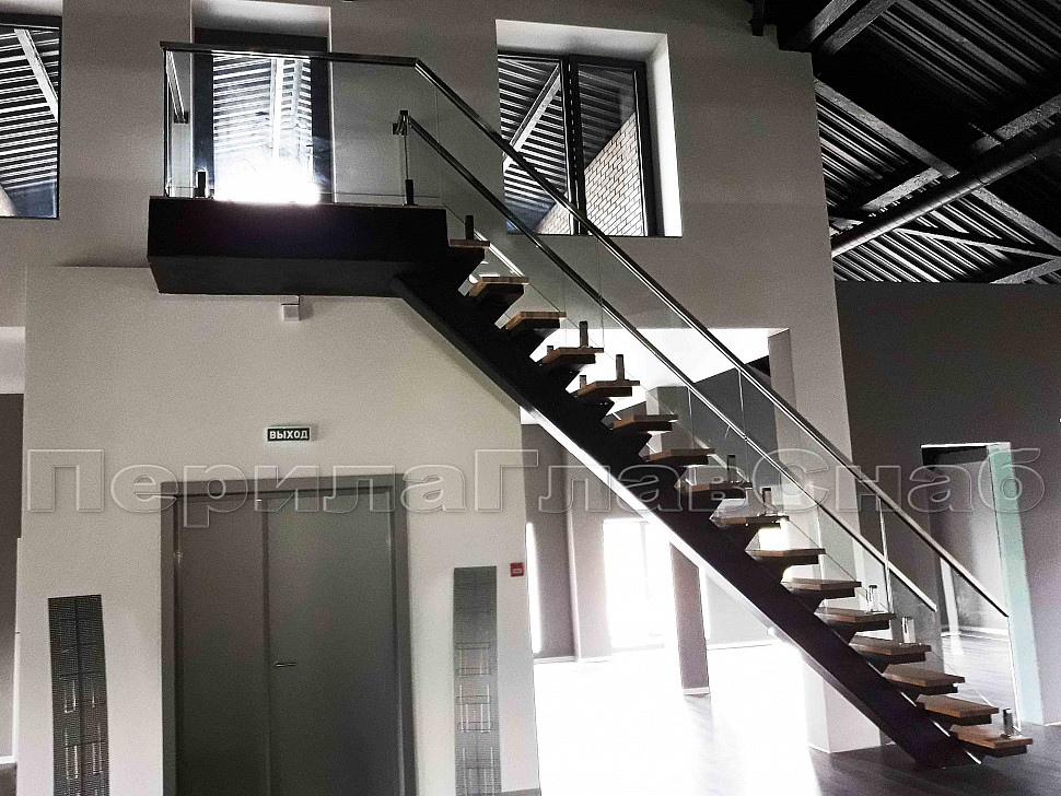 Было рассмотрено два вида крепления стеклянных ограждений, а именно на алюминиевом профиле и мини-стойках. Алюминиевый профиль в рамках этого конструктива установить нельзя, поэтому решение было принято сделать стеклянные ограждения на квадратных мини-стойках. Ограждения внутренние на несущем стекле, конструктив: высота 1000мм от уровня пола. Поручень выбрали с пазом – шлифованный, размер 60*40, благодаря текстуре шлифовки смотрится очень современно и стильно.