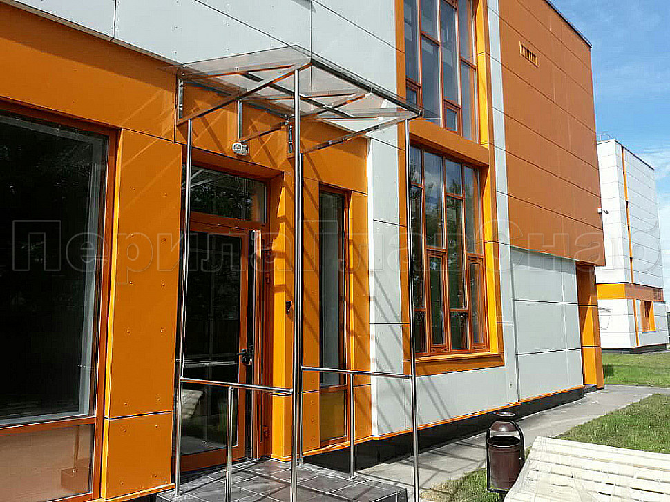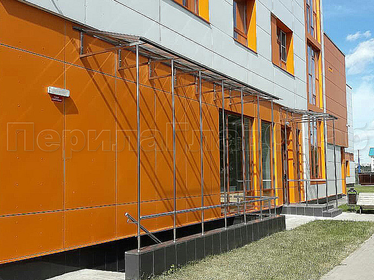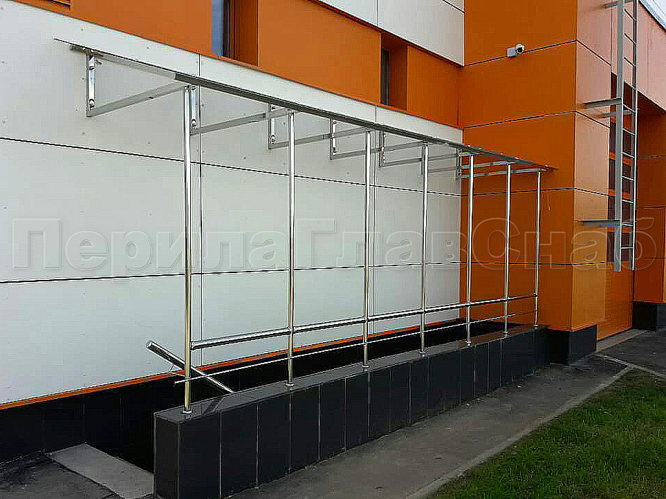 Здание очень яркое и заметное, а наши козырьки очень выгодно сочетаются с оранжевым цветом здания. Конструктив: козырек односкатный (от стены) над приямком из полированной нержавеющей стали марки AISI-304. Рама труба 40х40х1,5мм. Опорные стойки на ограждения приямков труба Ф50,8х1,5мм опираются на стойки ограждения.