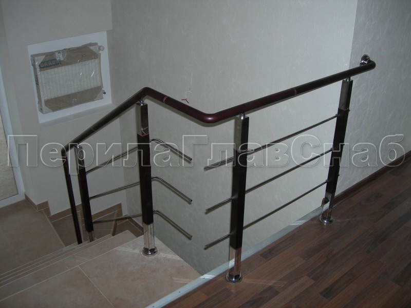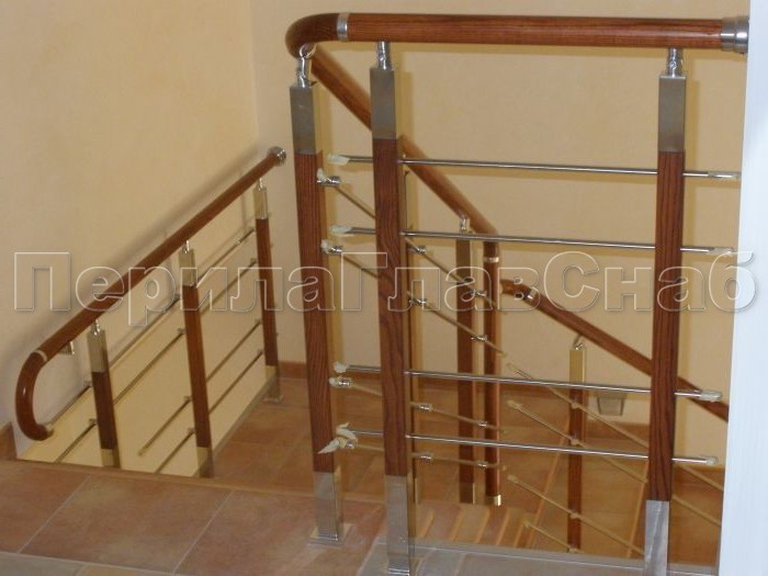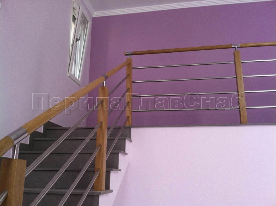 Четыре ригеля на держателях, квадратный поручень и стойки с деревянными вставками