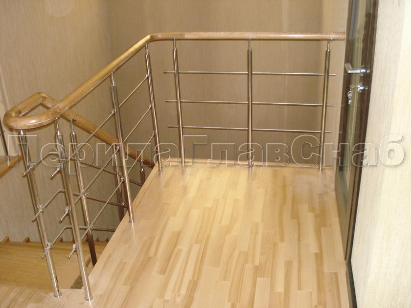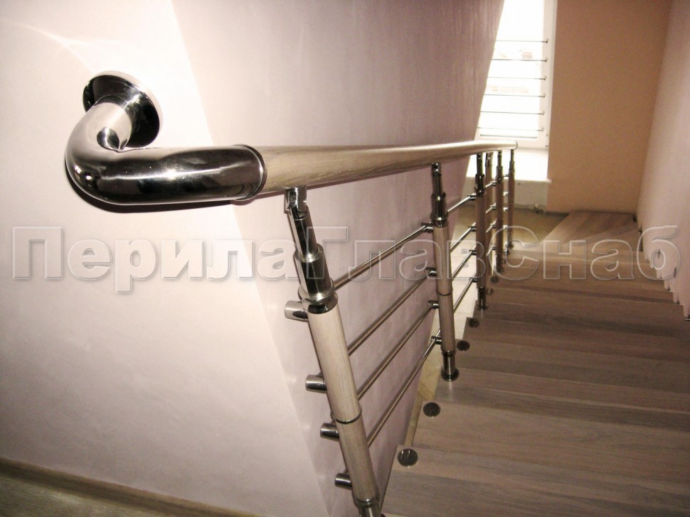 Три ригеля на сварке, квадратный деревянный поручень и круглые стойки