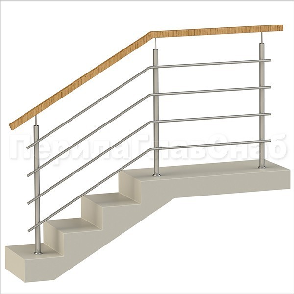 Четыре ригеля на сварке, квадратный деревянный поручень и круглые стойки