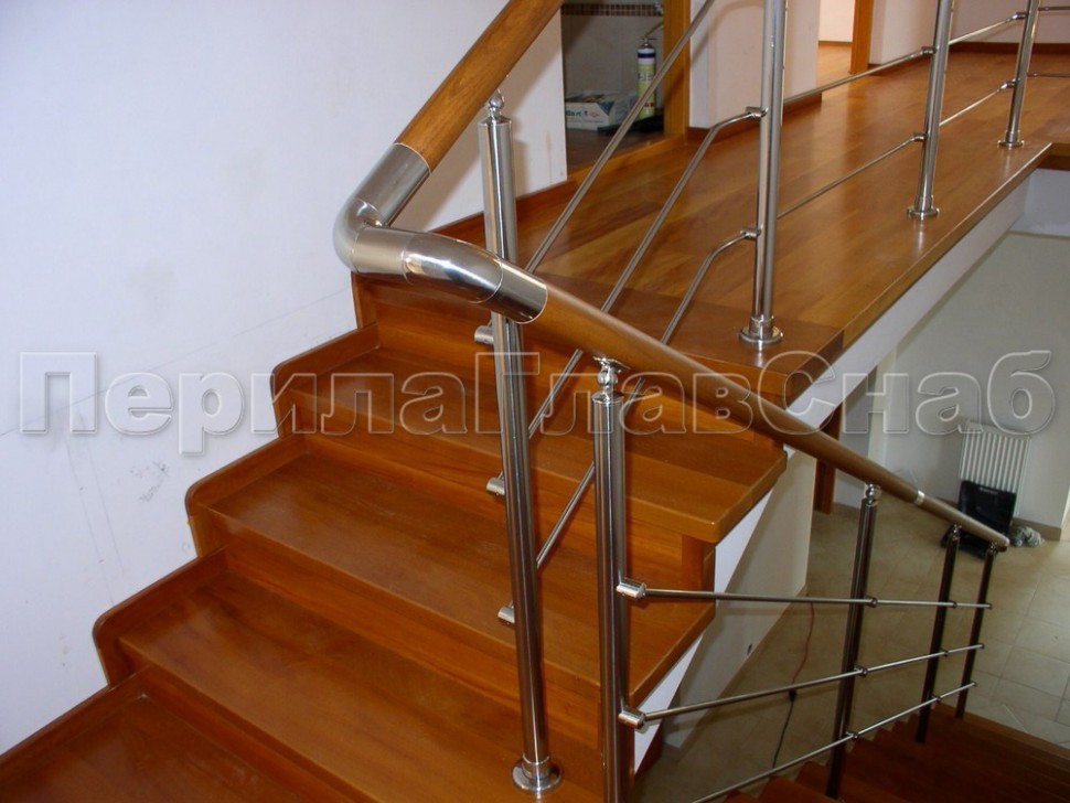 Нержавеющие ограждения без ригелей с круглым деревянным поручнем и стойками с деревянными вставками