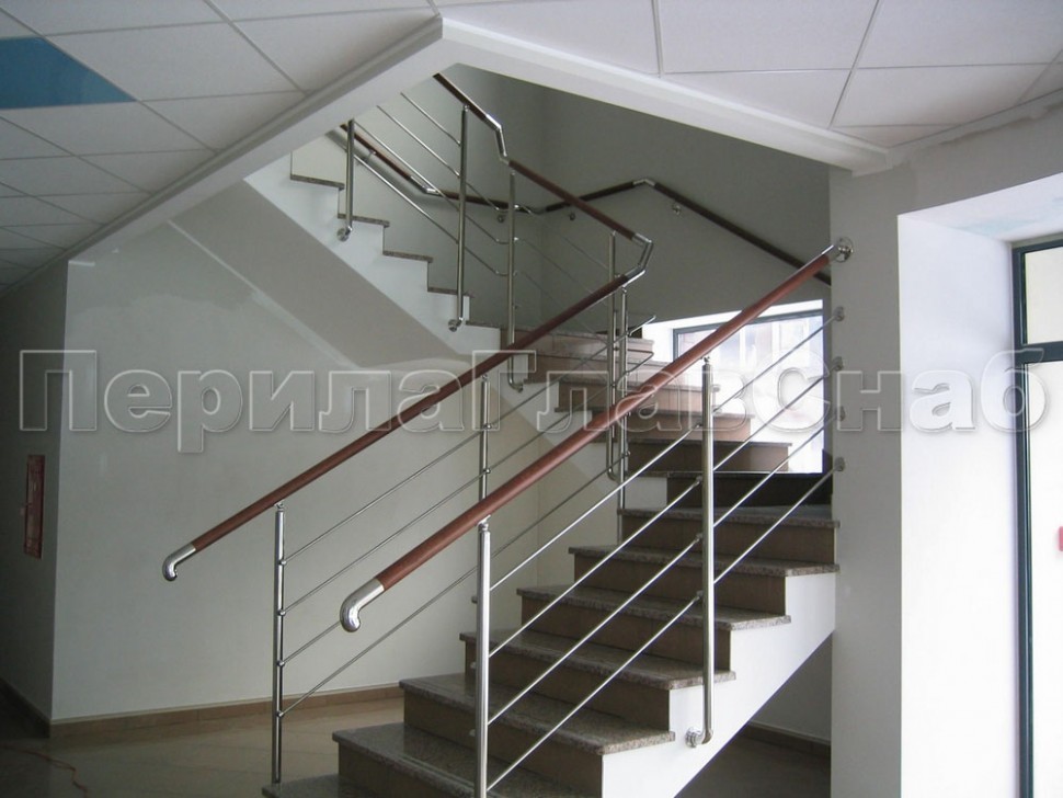 Четыре ригеля на держателях, квадратный деревянный поручень и квадратные стойки