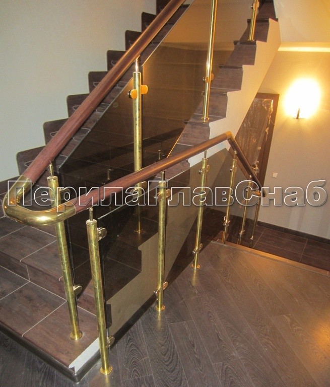 Ограждение лестницы со стеклом, тонированным в массе, стойки и завязки поручня из латуни