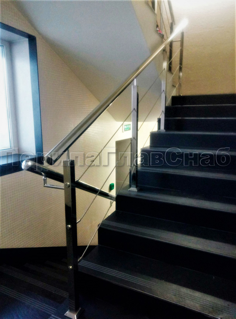 Ограждения из нержавейки. Заполнение из 4х тросиков. Квадратные стойки.
