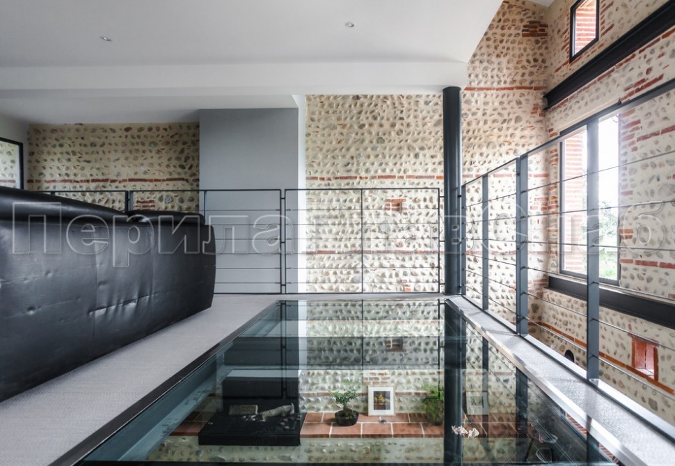 Ограждение лестницы со стеклом, тонированным в массе, стойки и завязки поручня из латуни