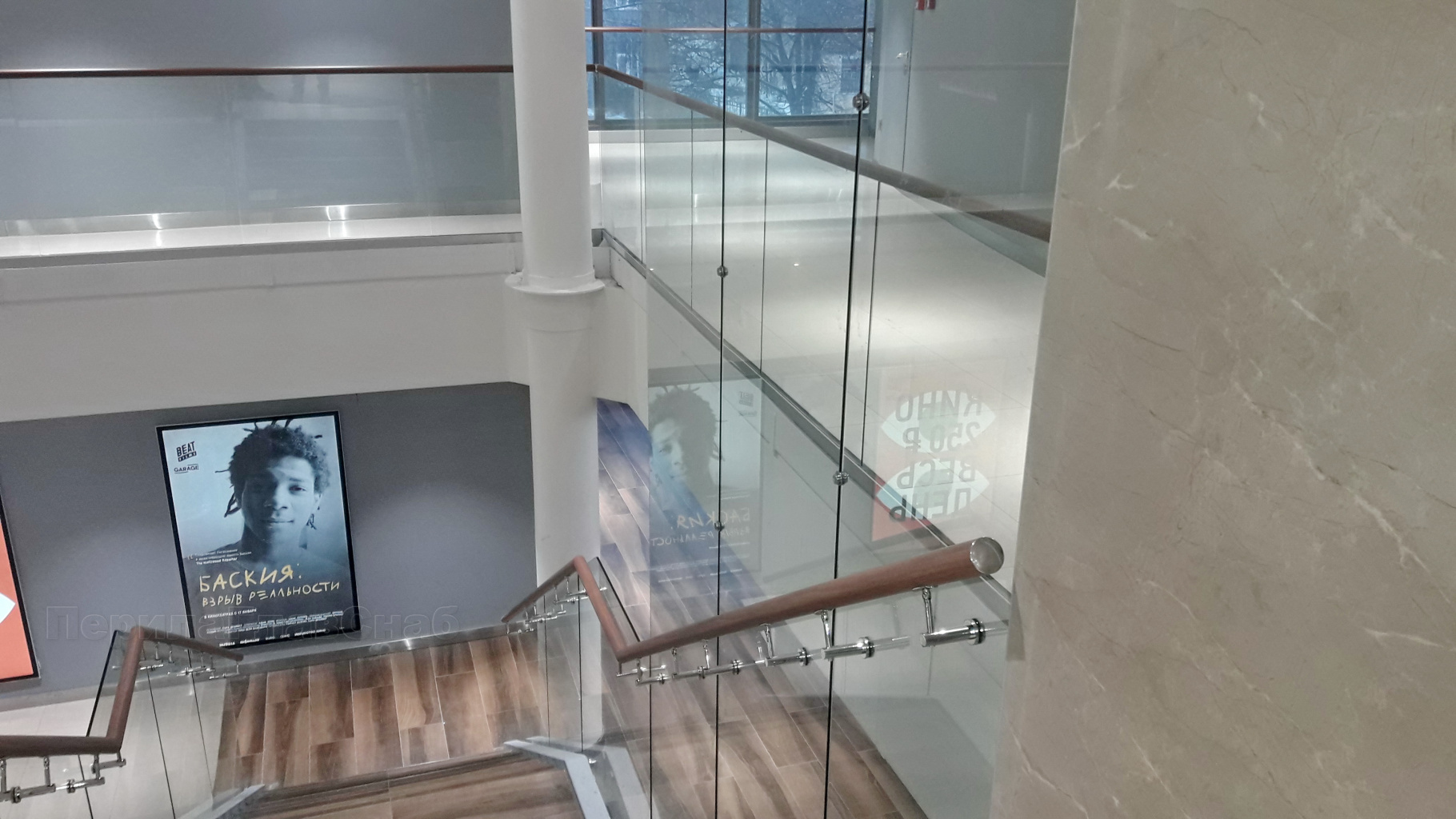 Ограждение с деревянным поручнем на выносе на точечном креплении на лестнице в Нижнем Новгороде. Готовые проекты ПерилаГлавСнаб