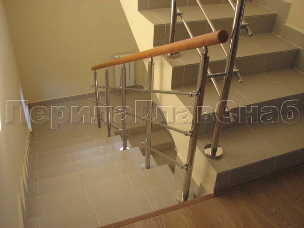 Нержавеющие ограждения без ригелей с круглым поручнем и стойками с деревянными вставками