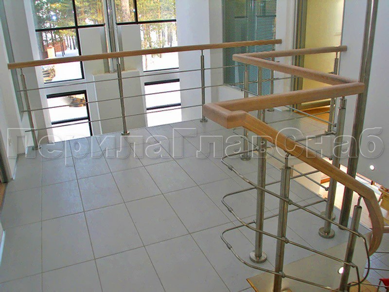 Нержавеющие ограждения без ригелей с круглым деревянным поручнем и стойками с деревянными вставками
