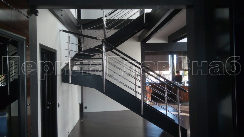 Четыре ригеля на сварке, квадратный деревянный поручень и круглые стойки