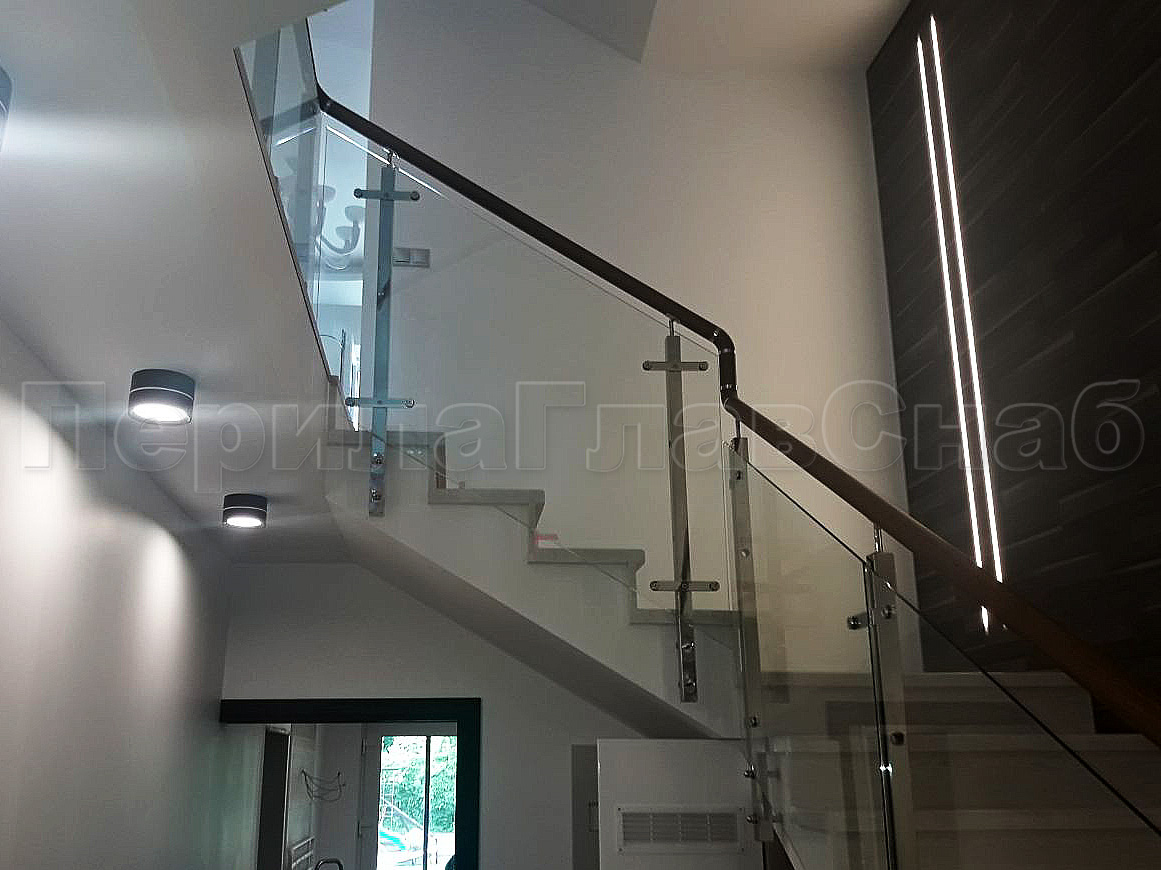 • Поручень - деревянная труба с пазом. Как дополнительная опция - можно включить подсветку стекла.