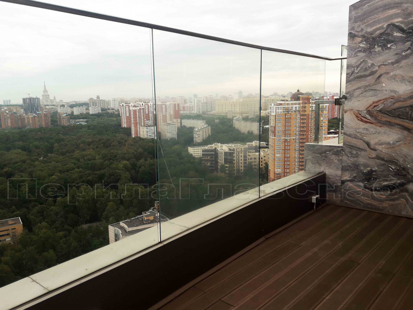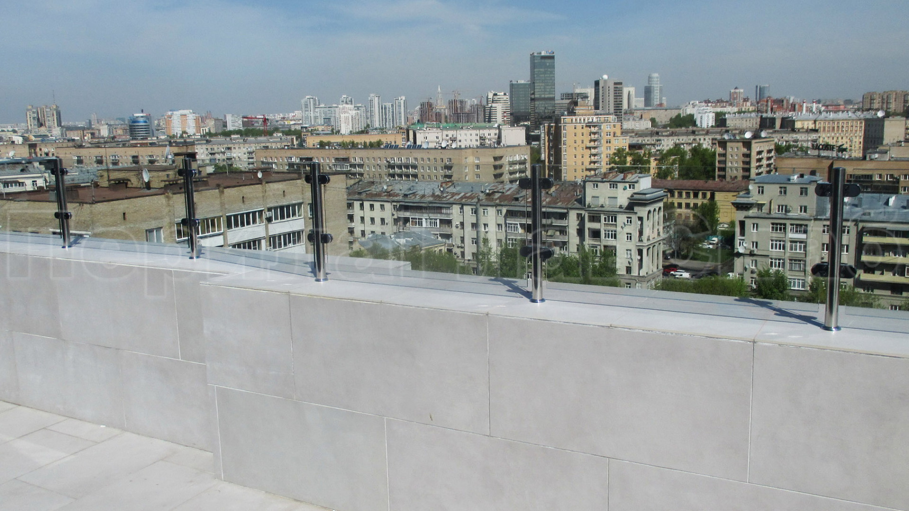 Стеклянные ограждения со стойками на кровле многоэтажного дома. Дешевый аналог.