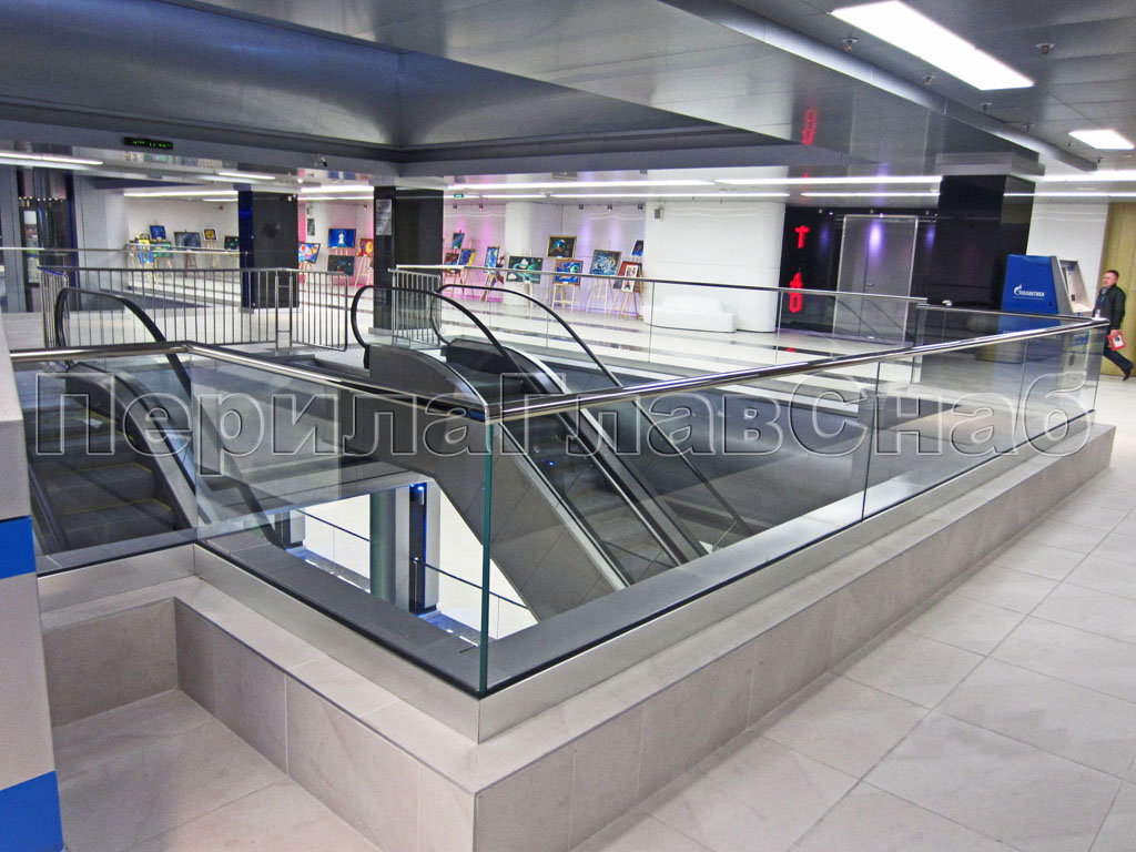 Фасад торгового центра полностью стеклянный, поэтому фронтальную часть ограждений входных групп заказчик попросил изготовить стеклянной на стойках. Эффекта прозрачности достигли путем использования 8-ми миллиметрового ультрапрозрачного стекла. Для стальных деталей перил использовали сталь тройной полировки AISI304L. Тройная полировка позволяет продлить срок жизни стальных ограждений.