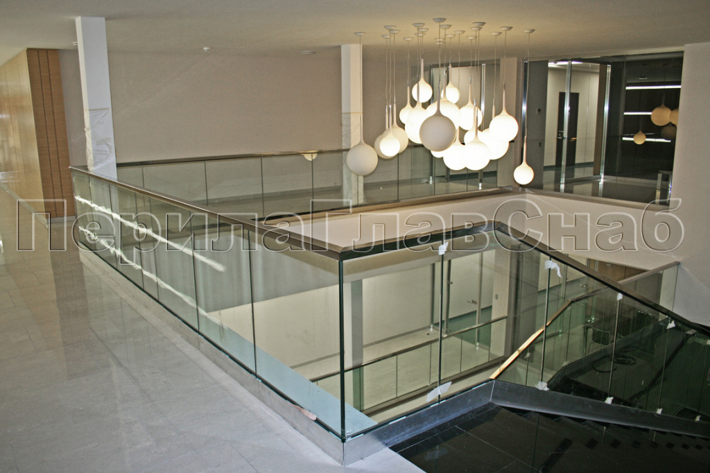 Описание: Заказчик поставил задачу установить надежные, удароустойчивые ограждения в офисный центр. Плюс требовалось подчеркнуть респектабельность и успешность проекта. Ограждения устанавливались в полностью подготовленный интерьер с мраморной плиткой. Сроки были очень сжаты, заказчик торопился со сдачей проекта. Наш отдел проектирования предложил следующее решение: ограждения на несущем стекле с креплением на анодированный профиль. Характеристики: